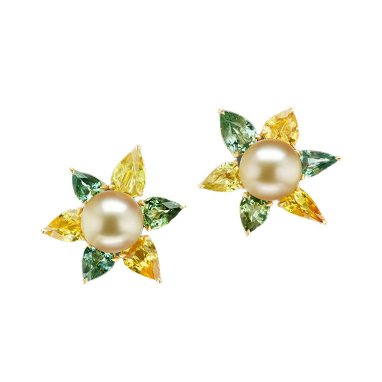 The earrings showcase two lustrous round Golden South Sea Pearls, each measuring 12.8 x 12.5mm. These pearls add a touch of sophistication and timeless beauty to the overall design. Surrounding the pearls are 12 pear-shaped Natural Green and Golden Sapphires. The sapphires exhibit a captivating range of colors, including rich greens and golden tones, creating a stunning floral pattern.
