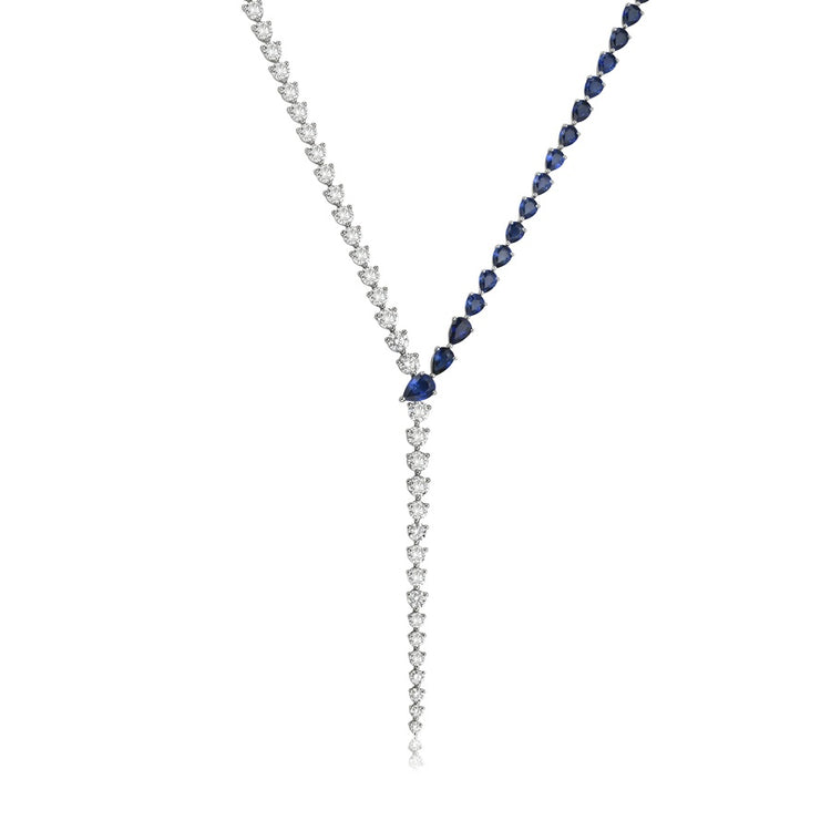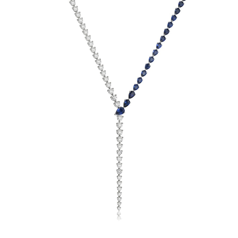 Brilliant round diamonds cascade down the left side, while pear-shaped blue sapphires flow along the right, meeting in a striking V formation. From there, the round diamonds continue their descent, and graduate down forming a graceful lariat that sparkles with every movement.