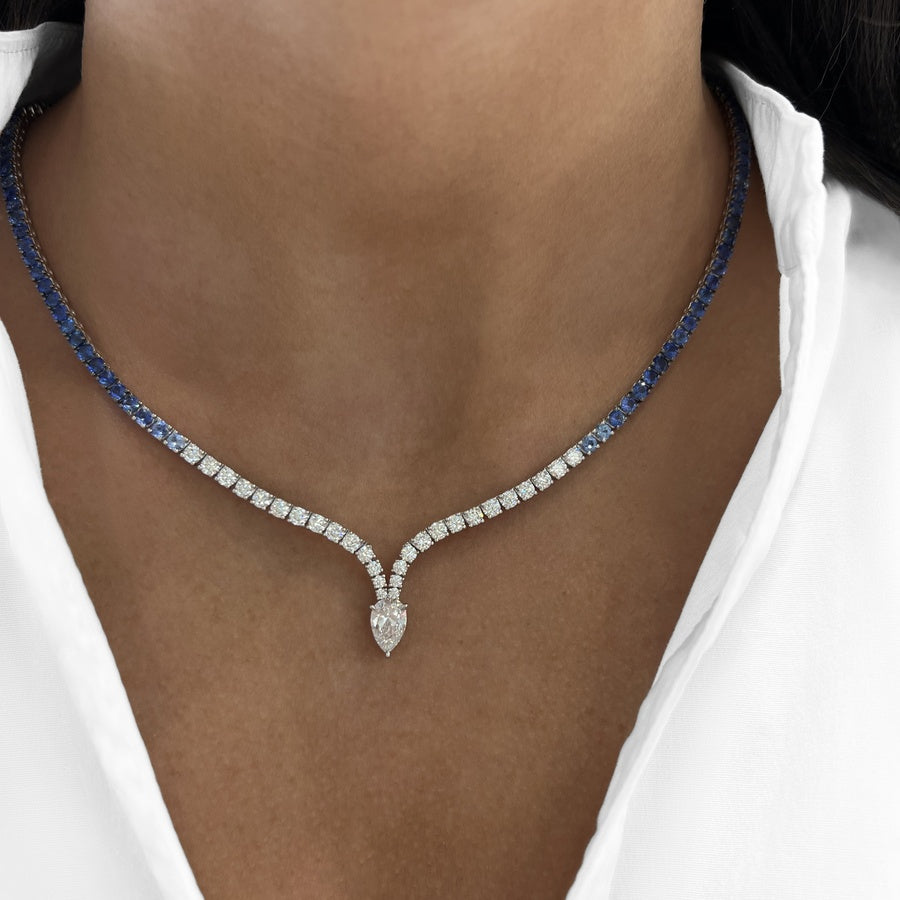 Set in 18k white gold, vibrant blue sapphires beautifully ombré into brilliant white diamonds, cascading to an elegant point where a pear-shaped diamond rests, bringing the entire piece together. Simple yet bold, this necklace makes a striking statement.