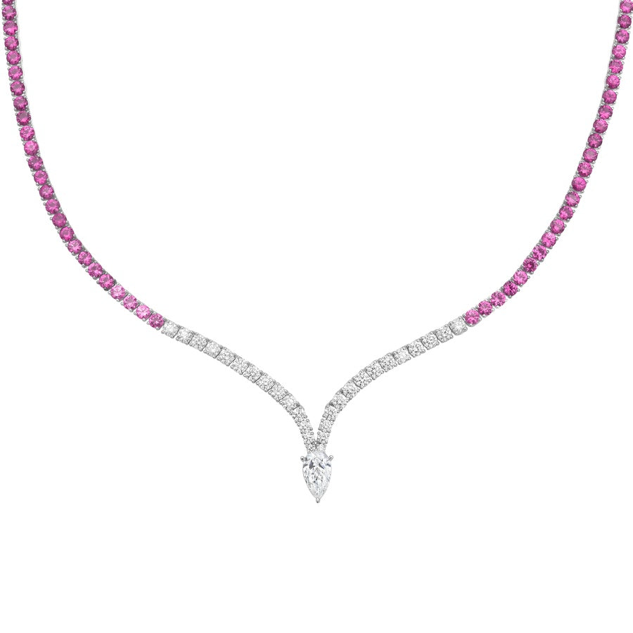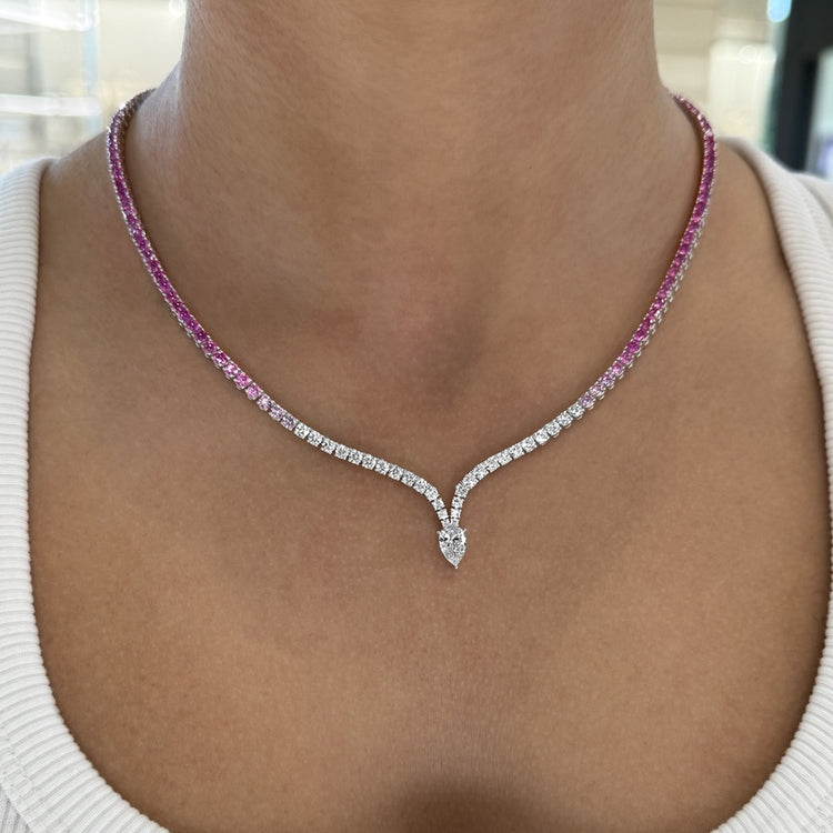 Set in 18k white gold, vibrant pink sapphires beautifully ombré into brilliant white diamonds, cascading to an elegant point where a pear-shaped diamond rests, bringing the entire piece together. Simple yet bold, this necklace makes a striking statement.