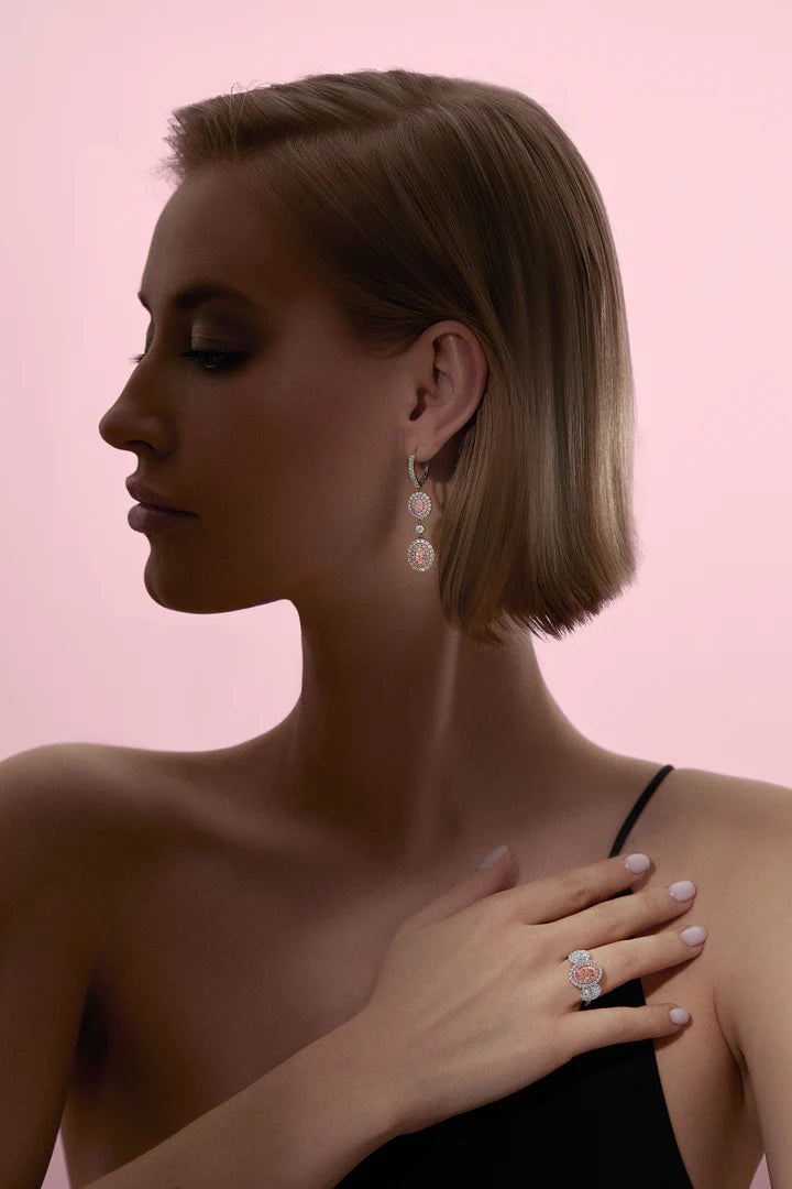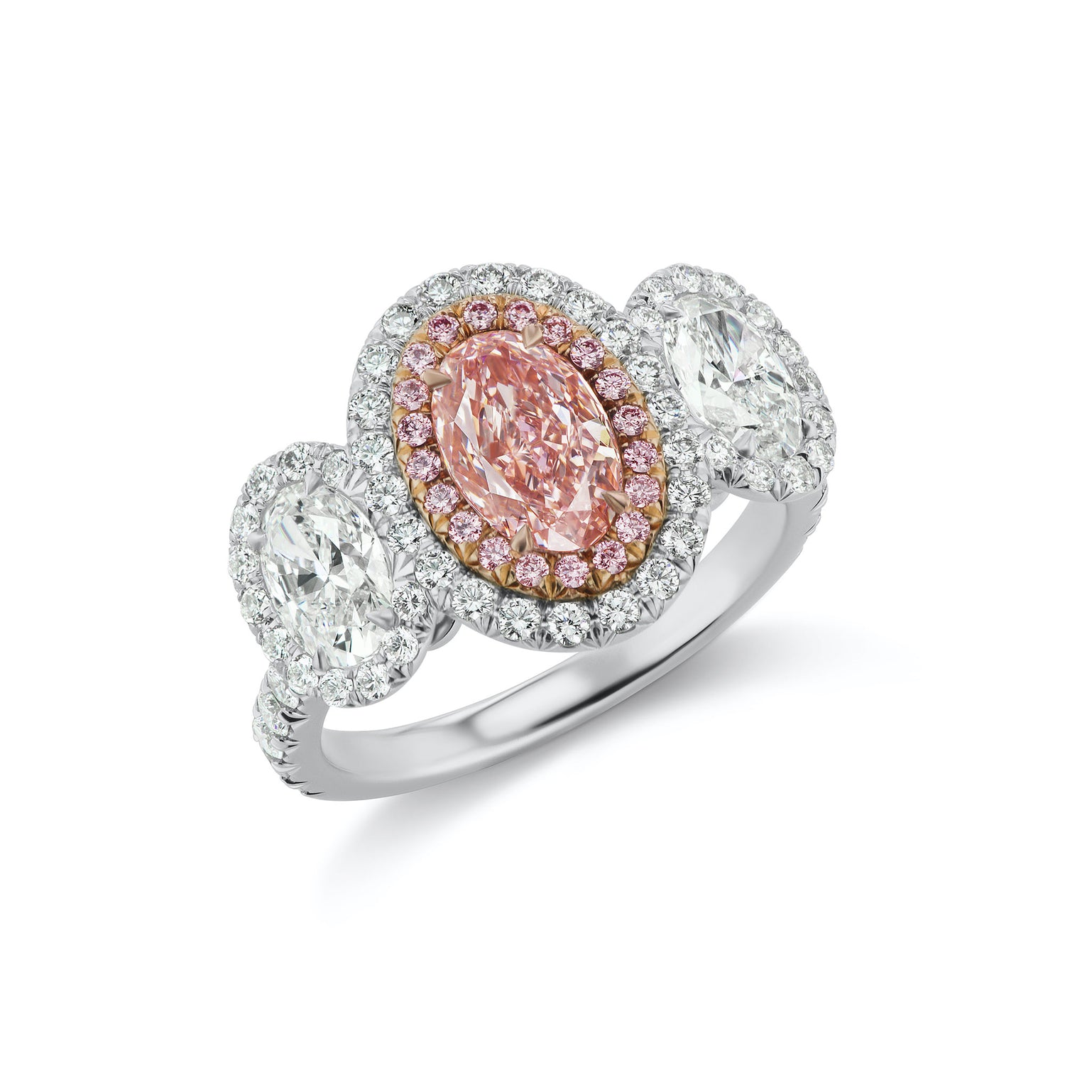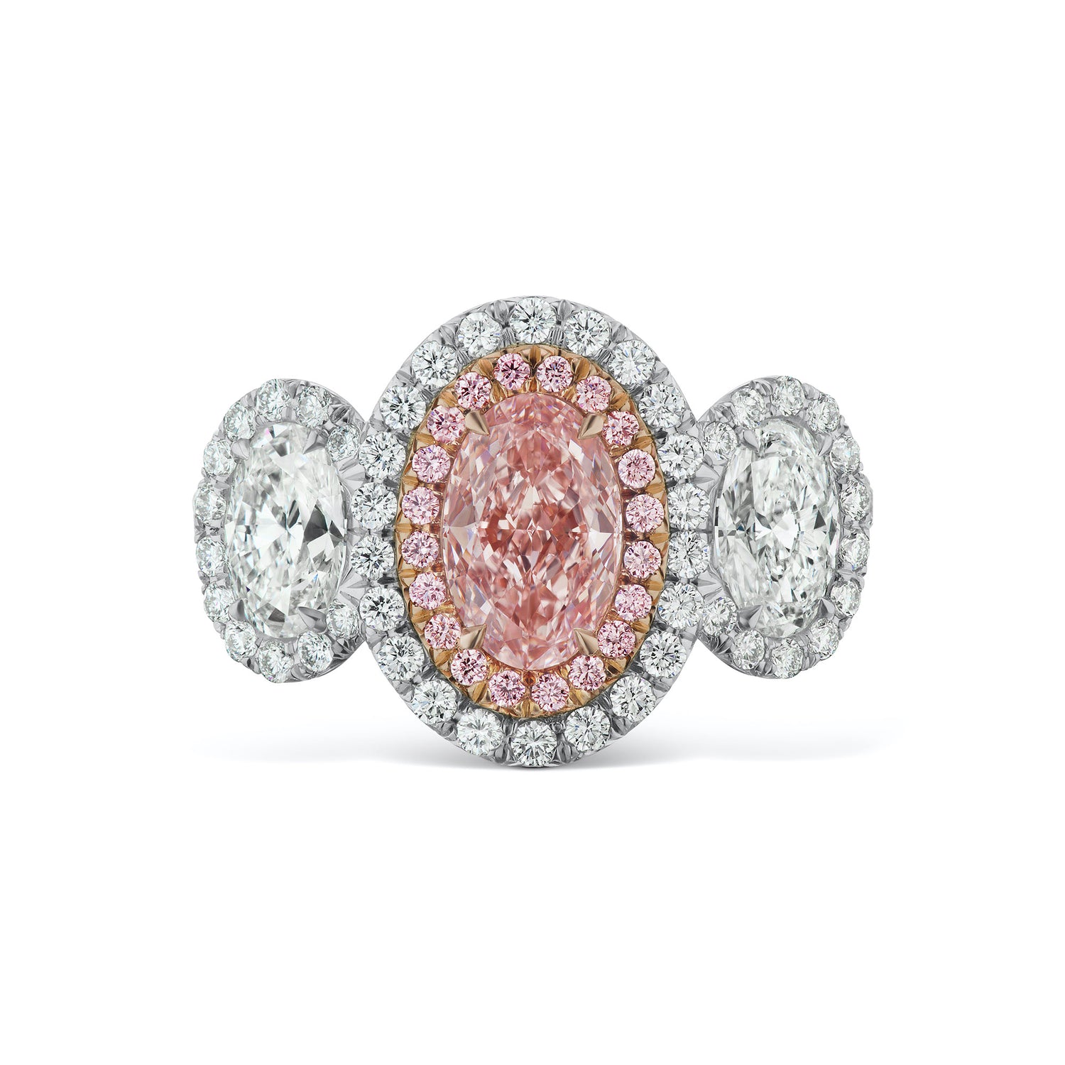 Like the beauty of a perfect sunrise or sunset, this ring, with its Fancy Orangy Pink diamond center stone and Argyle Pink Diamond halo will take your breath away. Set in platinum and rose gold, the white diamond side stones with white diamond halos command undeniable attention when interacting with light, providing brilliant fire and sparkle.