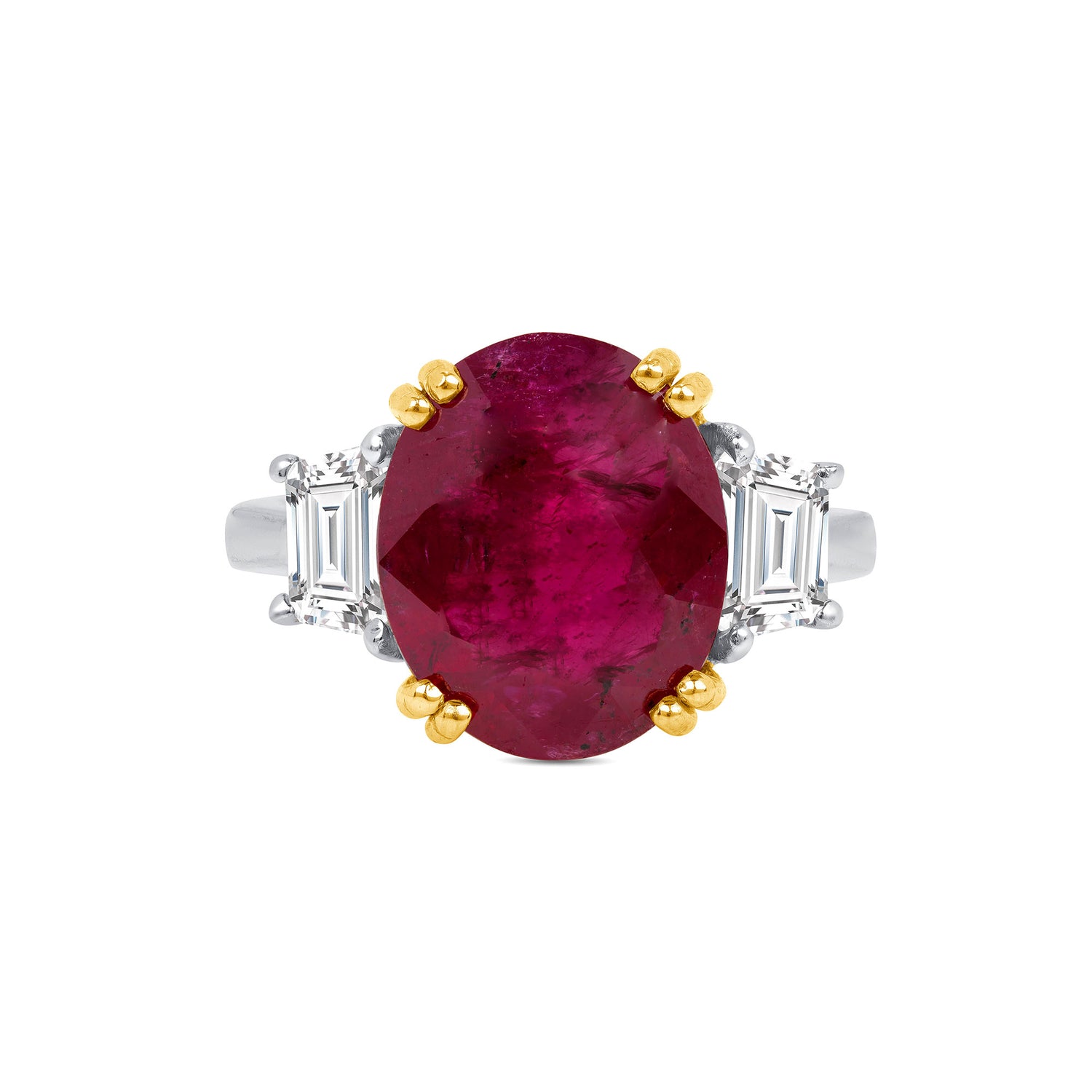 The unique ruby ring with diamonds showcases a natural oval shaped red ruby that is complemented by trapezoid diamond side stones set in mixed white and yellow gold. Wear this as a striking right-hand ring or as modern engagement ring.