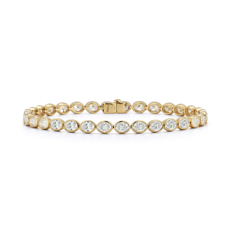 Elegant and yet unique, oval shaped diamonds are stylishly set in an east-west pattern in this beautiful tennis bracelet. Diamonds of this color and clarity are as unique as you and you will both glisten through this gorgeous bezel set bracelet.