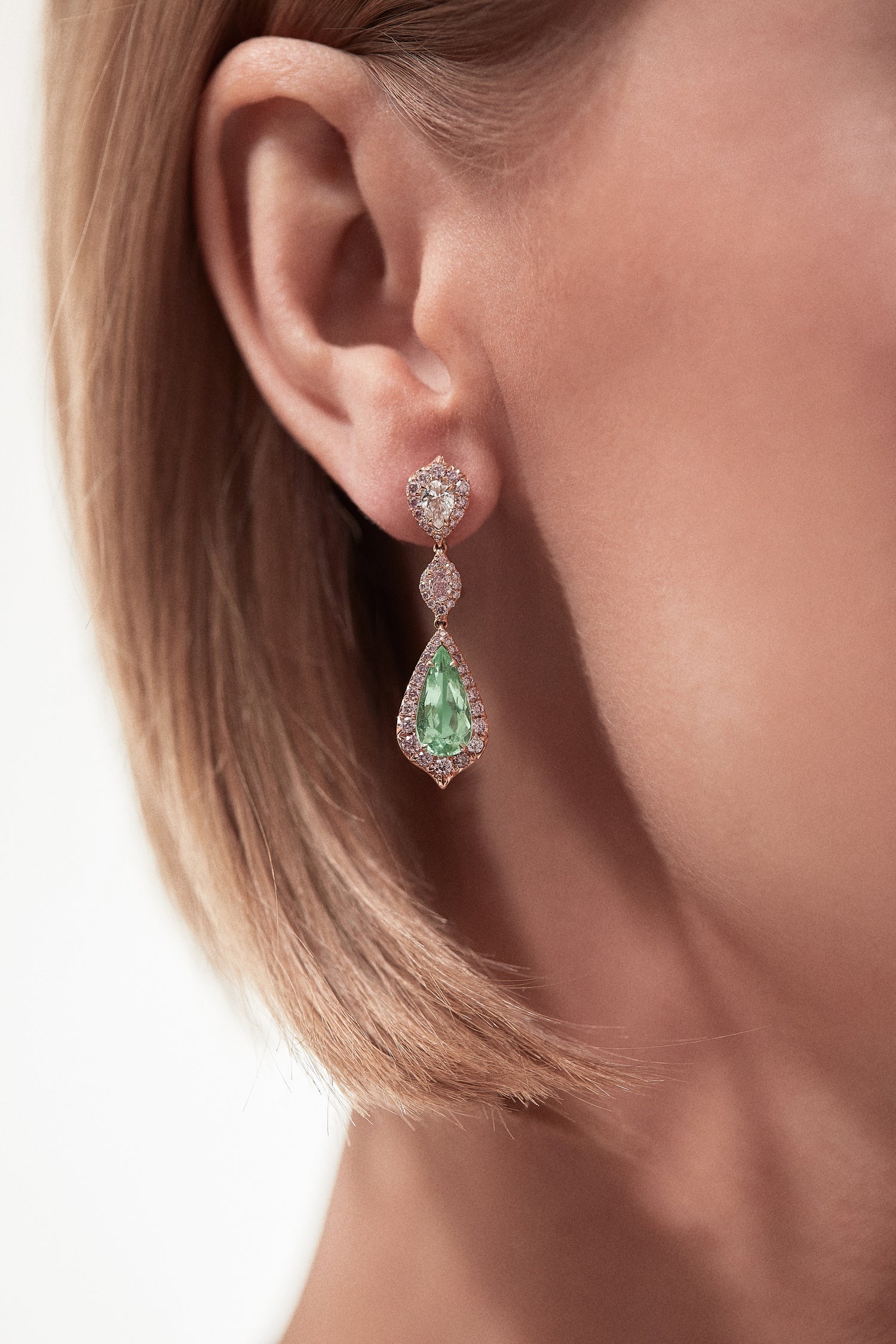 The rarest form of tourmaline, boasting neon-like green, these earrings feature two matching 2.87 carat Mozambique Paraiba tourmaline briolettes set with Argyle Pink diamonds and white diamonds. The earrings sparkle with a feminine luminosity; a timeless choice with unmatched sparkle.