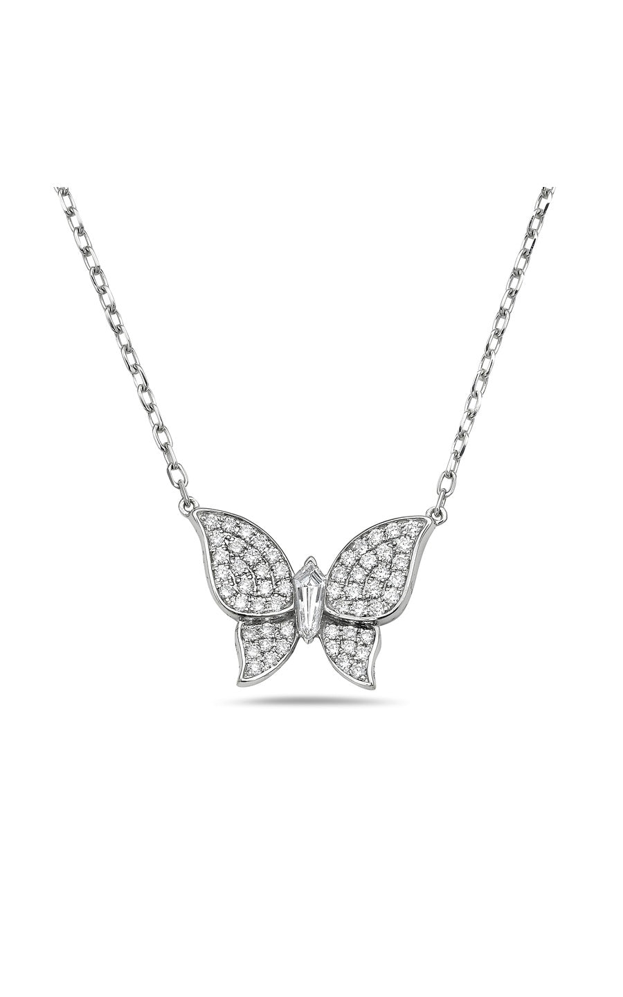 A beautiful butterfly crafted in 18k white gold, featuring pavé diamond wings that sparkle with brilliance. At its heart, a specially cut, full kite-shaped diamond adds a bold and captivating touch.