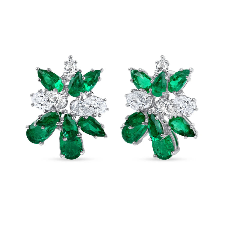Pear Shape Colombian Emerald and Diamond Cluster Stud Earrings