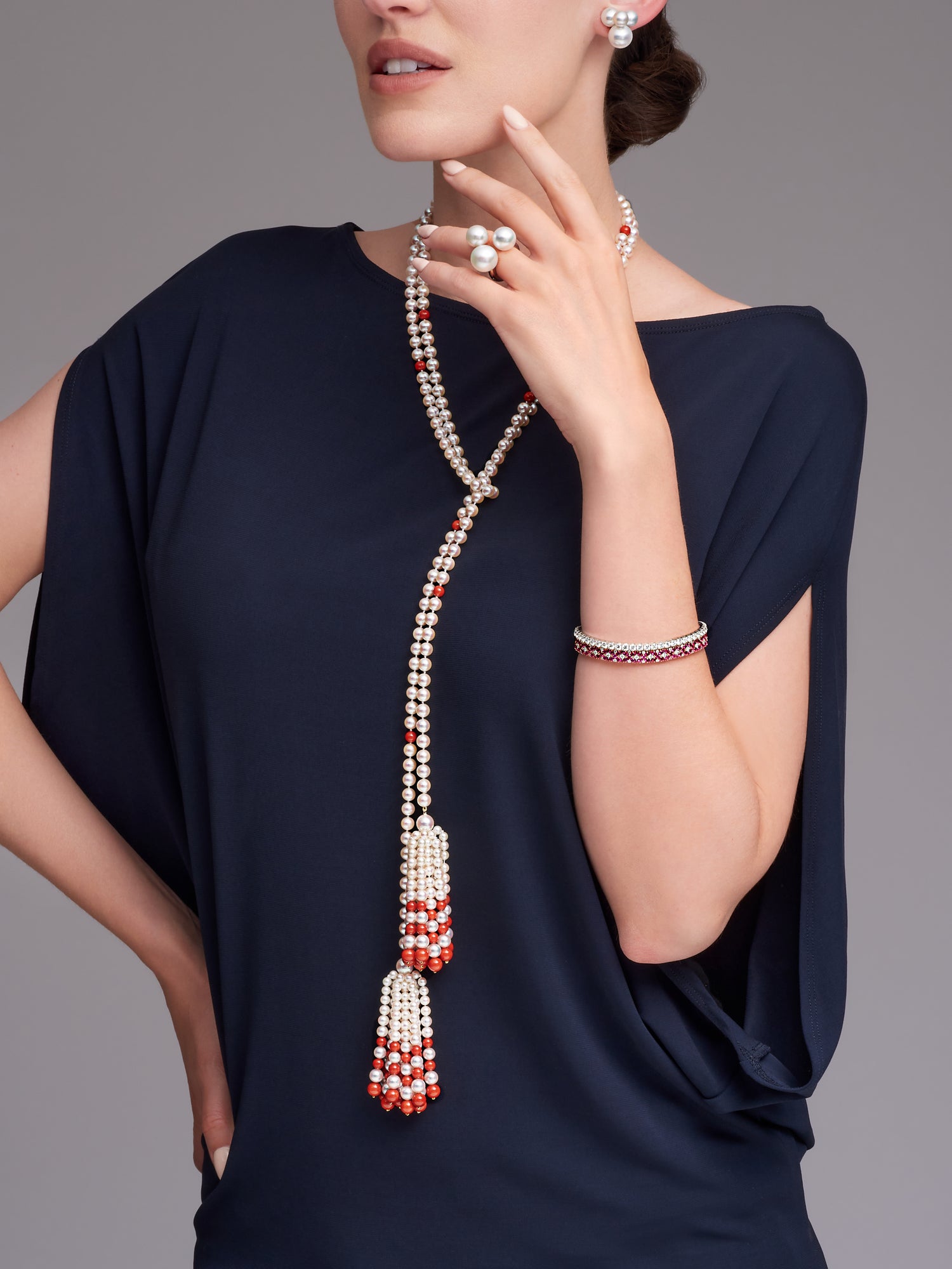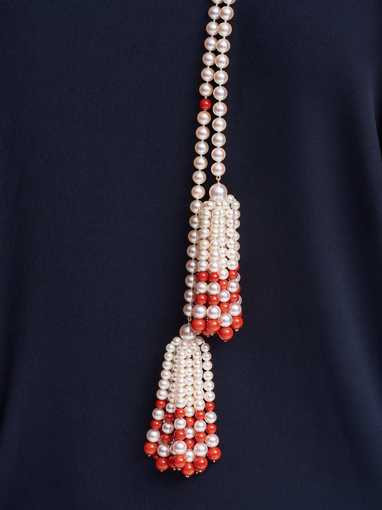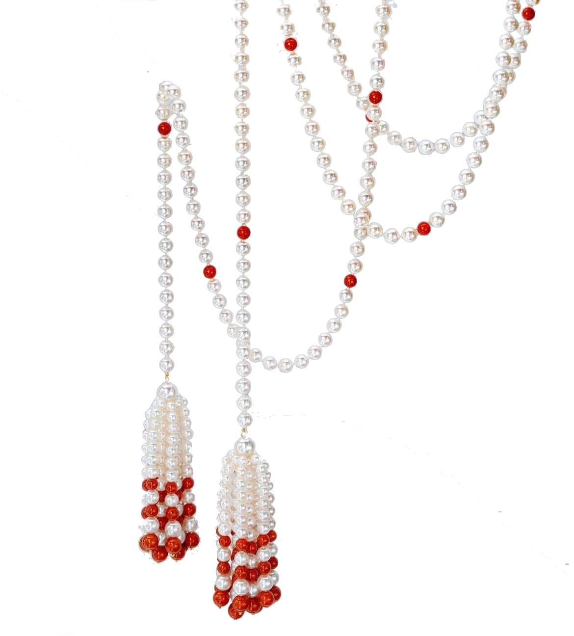 Japanese Akoya Cultured Pearls and Sardinlan Coral Beads Tassel Lariat