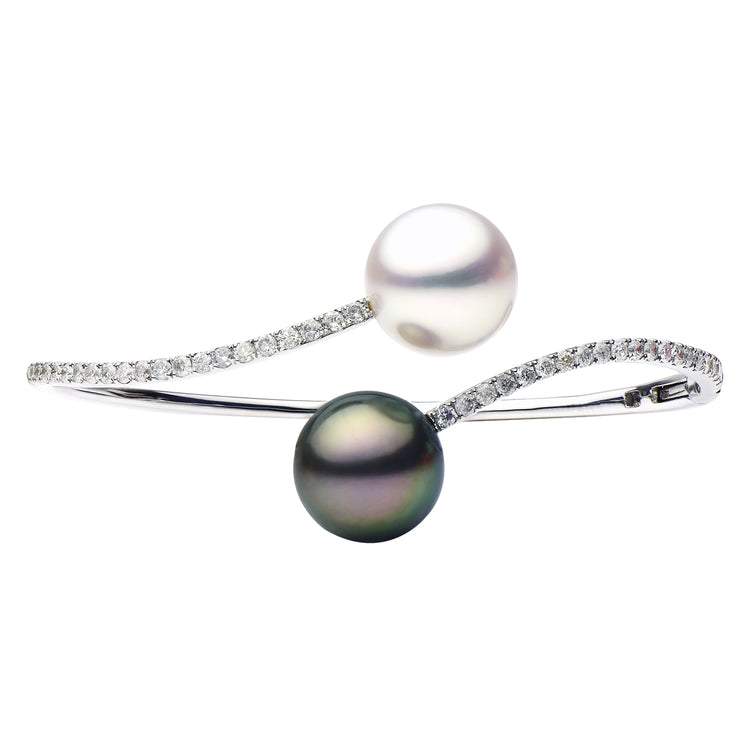 The combination of the radiant diamonds and the alluring Tahitian pearls creates a piece that effortlessly elevates any ensemble, adding a touch of glamour and elegance to any occasion. At each end of the bangle rests a Tahitian pearl, one black and one white, creating the perfect contrast. While along the band you will find 42 brilliant round diamonds.