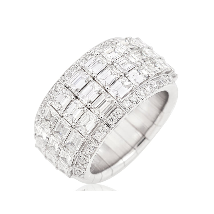 Sculptural and sophisticated, this PICCHIOTTI Xpandable™ ring in 18K white gold features five luminous rows of diamonds, set halfway around the band. 33 emerald-cut and 44 round brilliant diamonds create a captivating balance of structure and sparkle. With PICCHIOTTI’s patented Xpandable™ mechanism, the ring flexes, expands, and contracts to fit sizes 6.5 to 11, combining timeless design with Italian innovation.