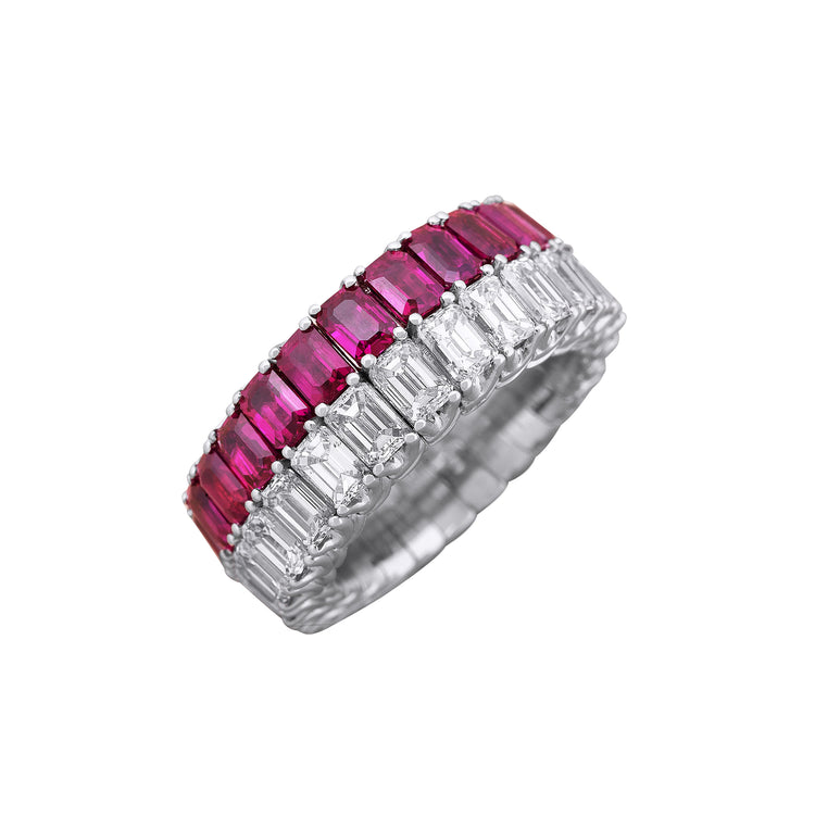 A vivid row of octagon cut rubies sits alongside a continuous row of emerald cut diamonds in this Picchiotti Xpandable™ Ruby and Diamond Mixed Cut Eternity Ring. The contrast between saturated red and clean diamond geometry creates a streamlined, architectural look that feels both modern and timeless in white gold. Engineered with Picchiotti’s signature Xpandable™ technology, the ring offers exceptional flexibility and a refined, comfortable fit.