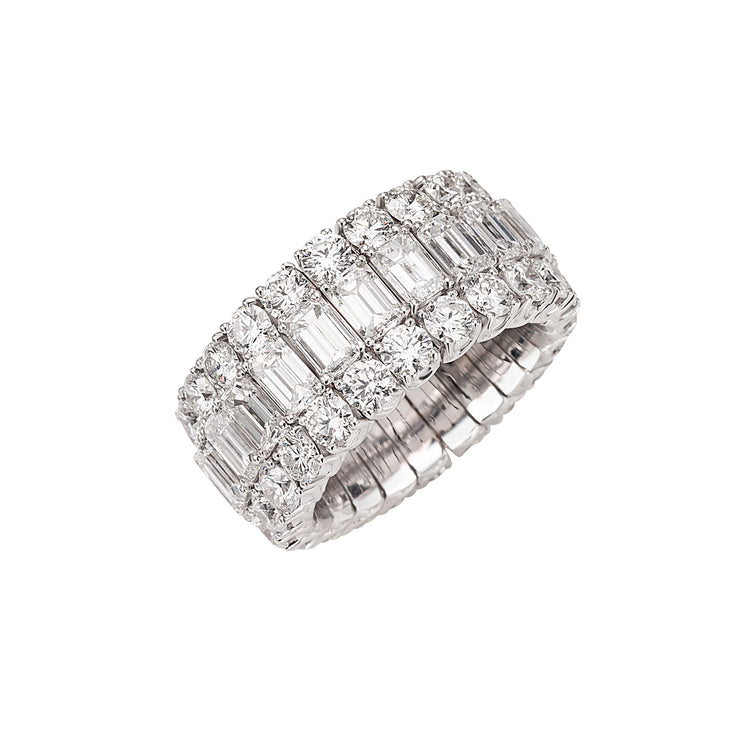 A masterpiece of Italian fine jewelry design, this PICCHIOTTI Xpandable™ ring in 18K white gold features 24 emerald-cut and 48 round brilliant diamonds totaling 10.03 carats (F–G color, VS–VVS clarity). The alternating cuts create a striking balance of geometry and brilliance, emblematic of PICCHIOTTI’s architectural design language. With the patented Xpandable™ mechanism, the ring adjusts effortlessly to fit sizes 6.75 to 10.25, merging luxury with modern comfort.