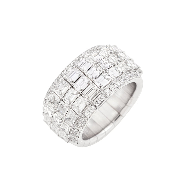 Sculptural and sophisticated, this PICCHIOTTI Xpandable™ ring in 18K white gold features five luminous rows of diamonds, set halfway around the band. 33 emerald-cut and 44 round brilliant diamonds create a captivating balance of structure and sparkle. With PICCHIOTTI’s patented Xpandable™ mechanism, the ring flexes, expands, and contracts to fit sizes 6.5 to 11, combining timeless design with Italian innovation.