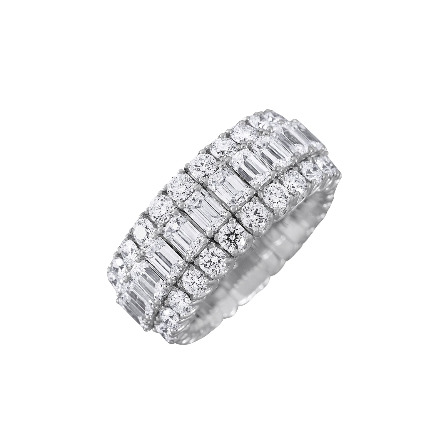 Crafted in 18K white gold, this PICCHIOTTI Xpandable™ ring combines 27 emerald-cut and 54 round brilliant diamonds totaling 7.23 carats (F–G color, VS–VVS clarity). The mix of step-cut geometry and radiant sparkle creates a striking play of light across three rows. With PICCHIOTTI’s patented Xpandable™ mechanism, the ring flexes effortlessly to fit sizes 6.75 to 9.5, blending timeless craftsmanship with modern comfort.