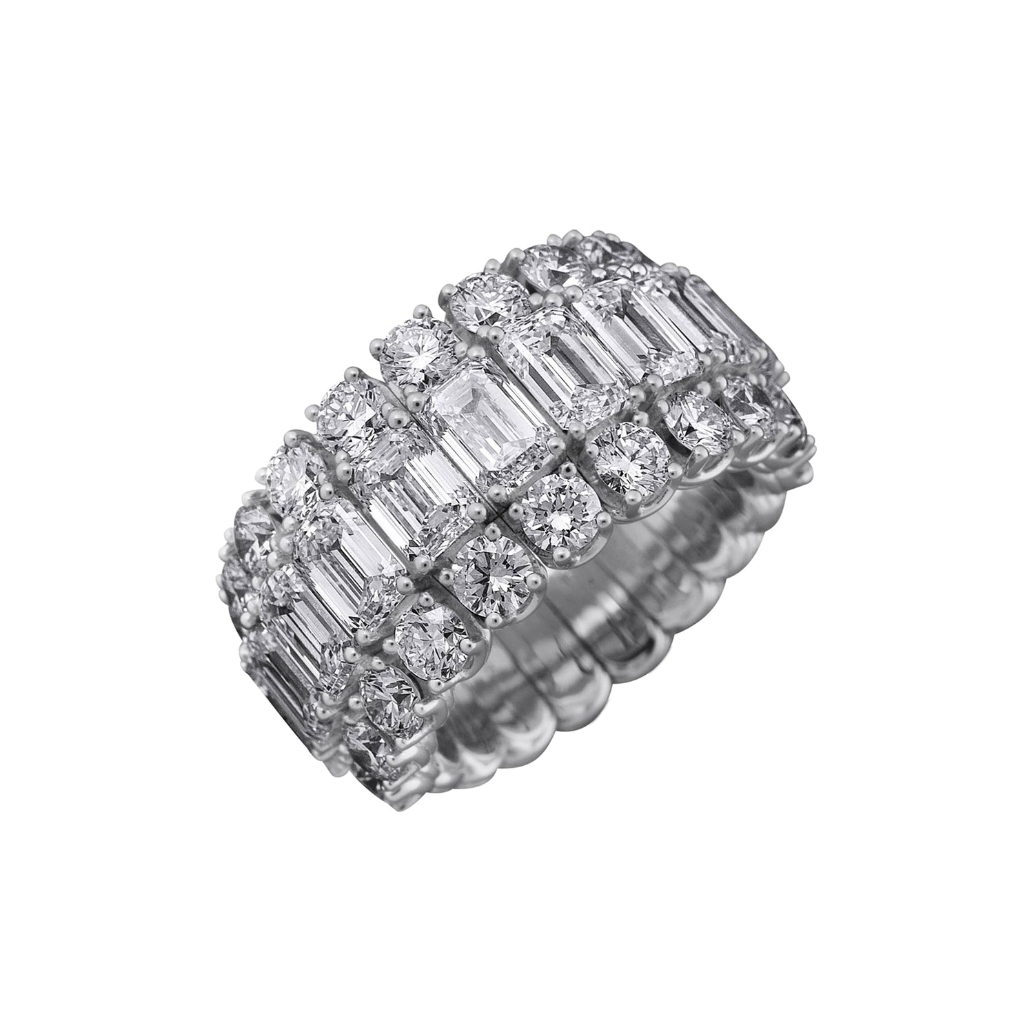 Elevate your hand with this wide, triple-row design, beautifully combining the clean geometry of emerald cuts with the distinct fire of round diamonds. This magnificent contrast creates a rich, dimensional texture that makes an undeniable statement, all expertly set in polished white gold. This level of dramatic style offers all-day wearability, thanks to Xpandable™ technology that adapts seamlessly to your natural movements.
