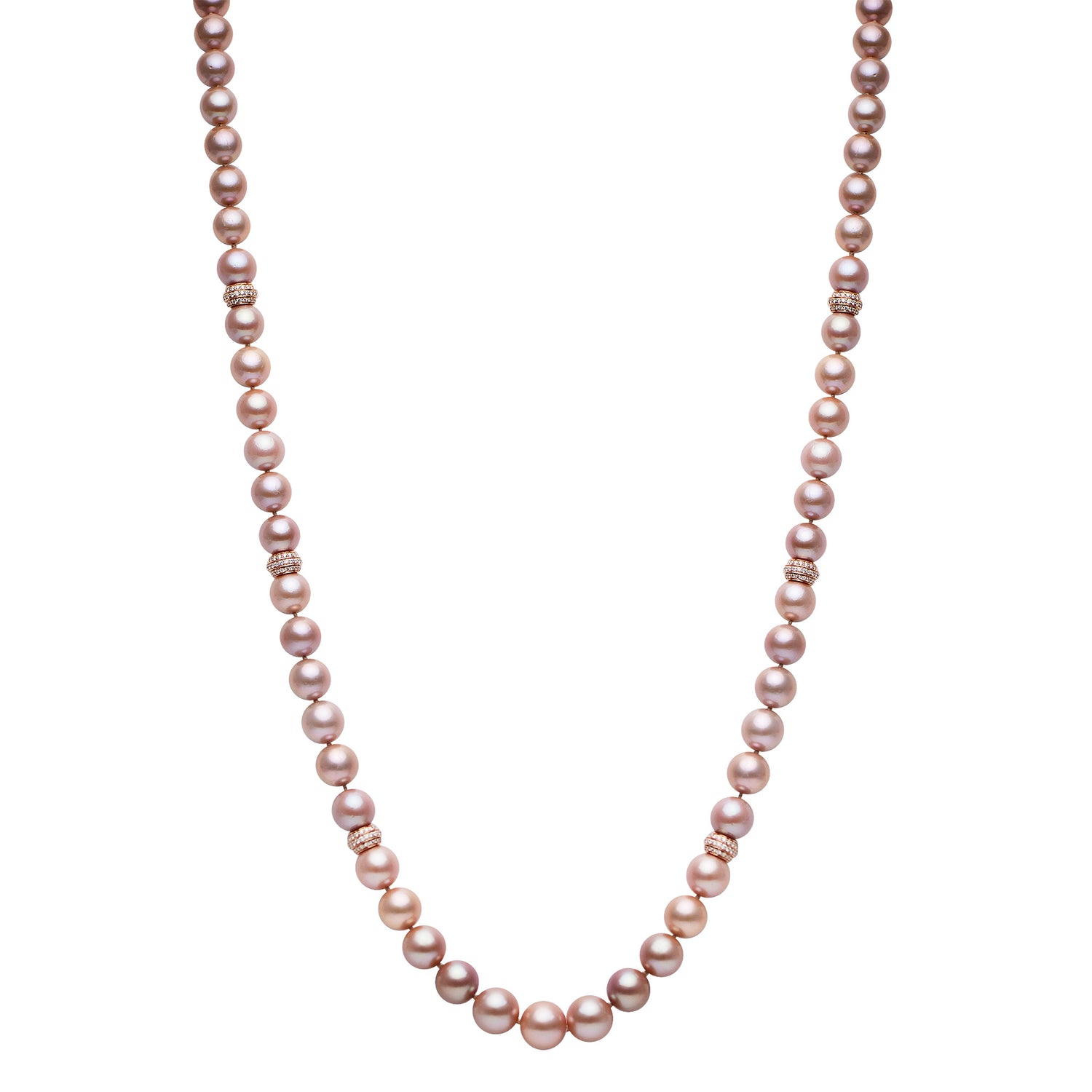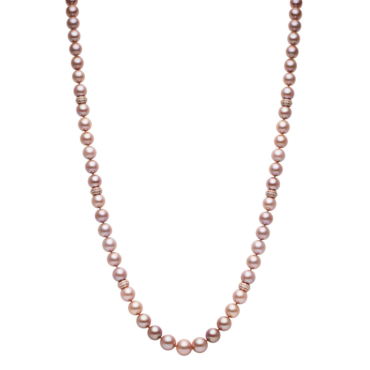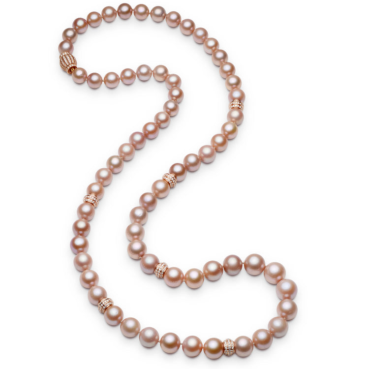 Bring incredible color to your look with this pink pearl and diamond necklace. The extra long "Opera Strand" features 7-16mm pearls and 6 diamond rondelles boasting over 4 carats!
