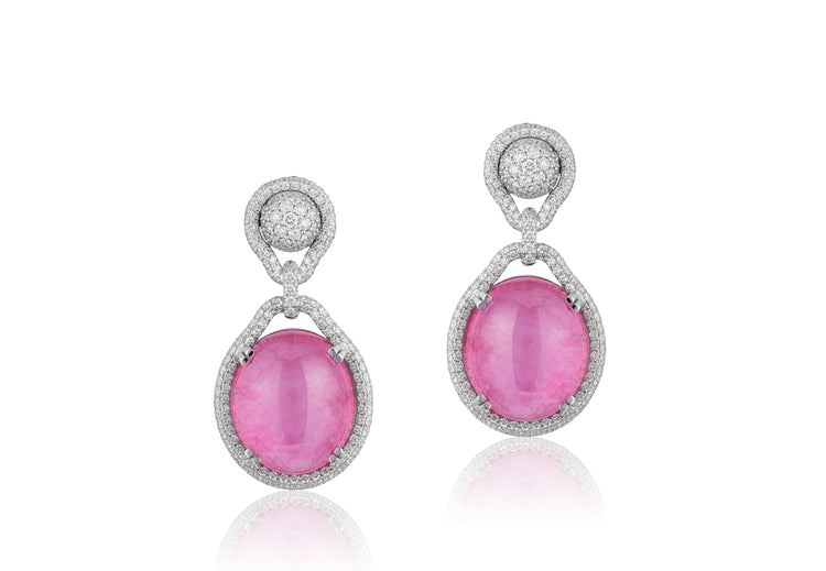 Dangling from domed pave diamond studs and wrapped in more diamonds, these pink tourmaline cabochon earrings sparkle from every angle and boast over 48 carats of tourmaline and over 3 carats of diamonds.