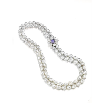 This necklace is a work of art, featuring a harmonious blend of rare and exquisite gemstones. The central focus is on 88 baroque South Sea pearls, ranging in size from 12.7 to 20.6mm. The baroque shape adds a natural and organic quality to the necklace. Nestled between the two strands of the South Sea pearls is a natural round purple jadeite, certified by GIA. Surrounding the jadeite, like petals, are 8 keshi pearls, each ranging from 12.0 to 17.0mm. Finally, adding a touch of sparkle are 8 round diamonds. For added versatility the flower converts to a Pendant.
