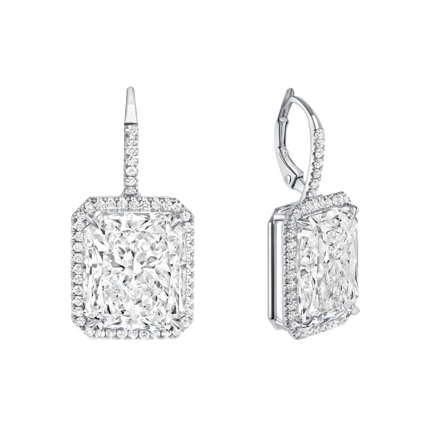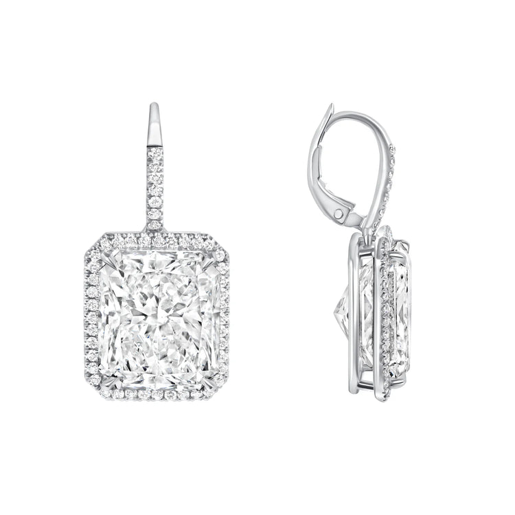 Radiant Cut Diamond Leverback Earrings with Pavé Diamond Halo