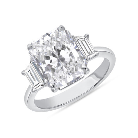 This diamond ring is a vision of icy white with a radiant cut diamond center stone and trapezoid side stones. Practice your royal wave wearing this treasure.