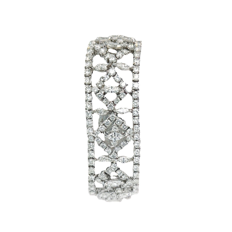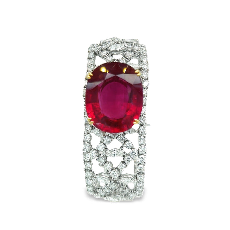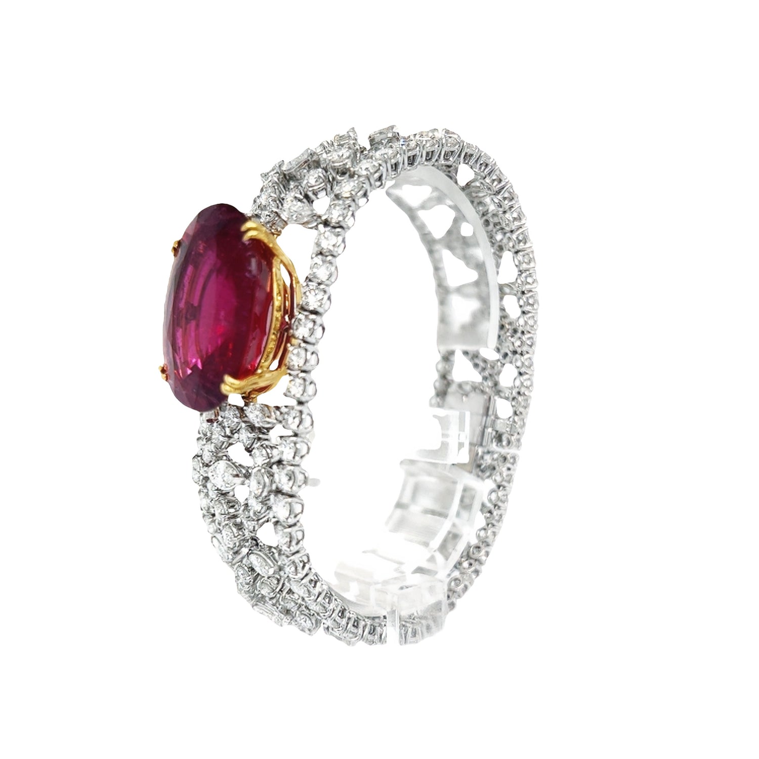 This bracelet makes a bold and elegant statement for any formal or special occasion, adding a touch of glamour and sophistication to any ensemble. At the heart of the bracelet is a oval cut rubellite with round and marquise cut diamonds surrounding it in an exquisite pattern.