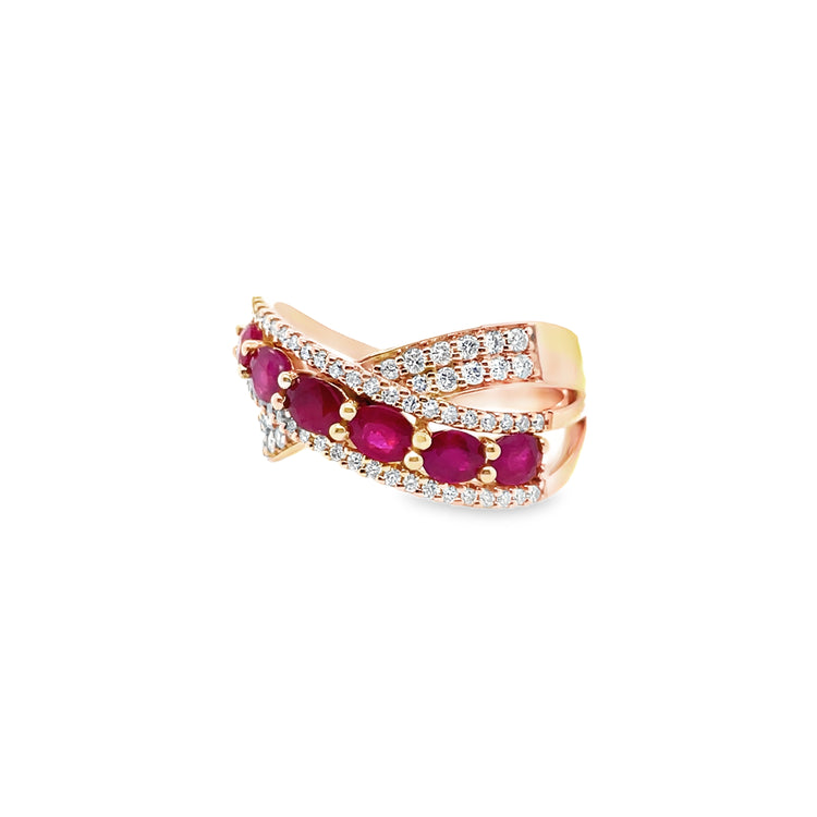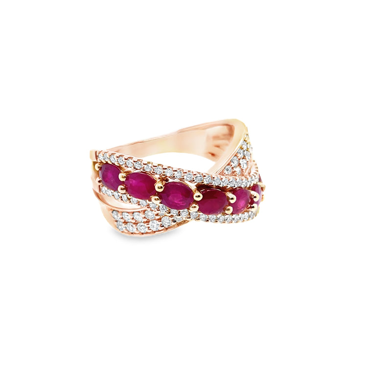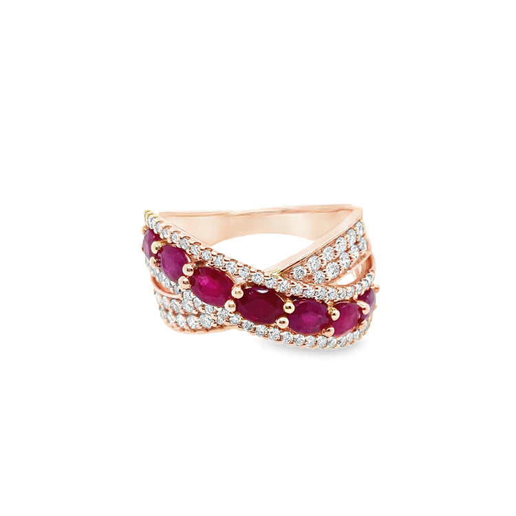 Add a pop of color with this ruby and diamond band. With a crisscross design, this ring combines the elegance of rubies with the shine of diamonds—you can have the best of both worlds. Each stone is held with 18-karat rose gold, helping to accentuate the rubies' colors.