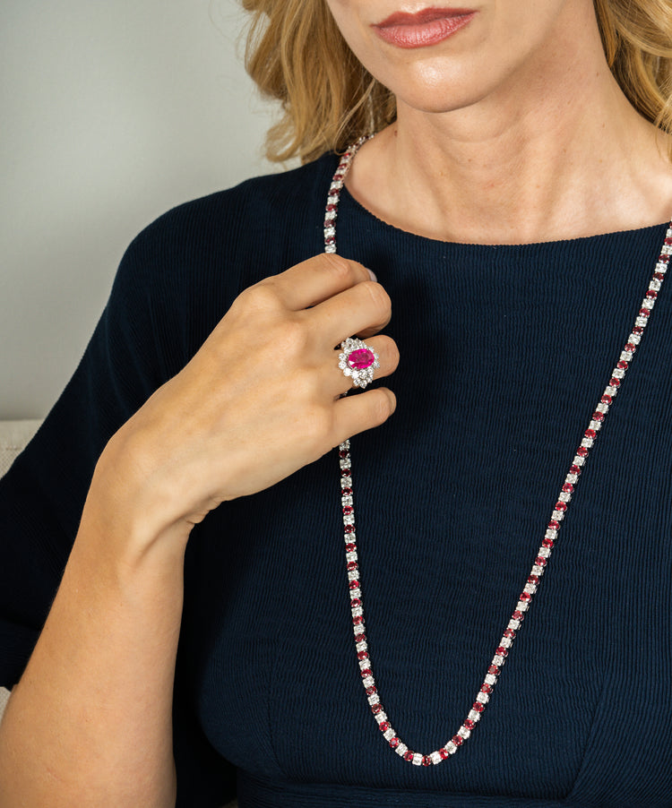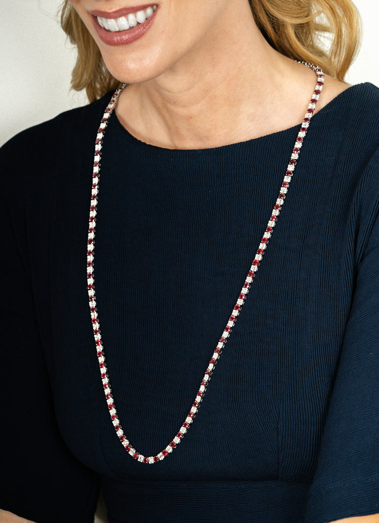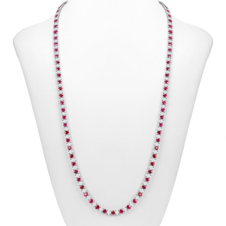 The radiant red of the rubies in this necklace showcase incredible shine, accented by baguette and round-cut diamonds for spectacular sparkle. This necklace creates a visually striking look and adds the right touch of fire and ice to your jewelry collection. Fashioned in 18K white gold, this slim and sophisticated design features bright red rubies alternating with sparkling diamonds.