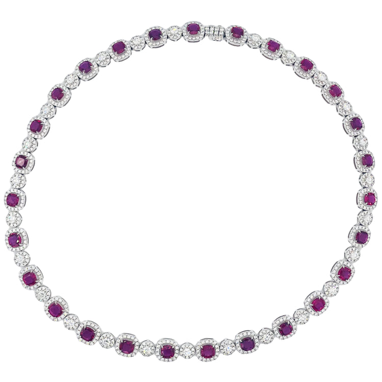 Add a pop of color and sparkle with this ruby and diamond necklace. Consisting of 27 Mozambique rubies and 26 white diamonds, the necklace is sure to make heads turn at evening events and become staple in your collection.