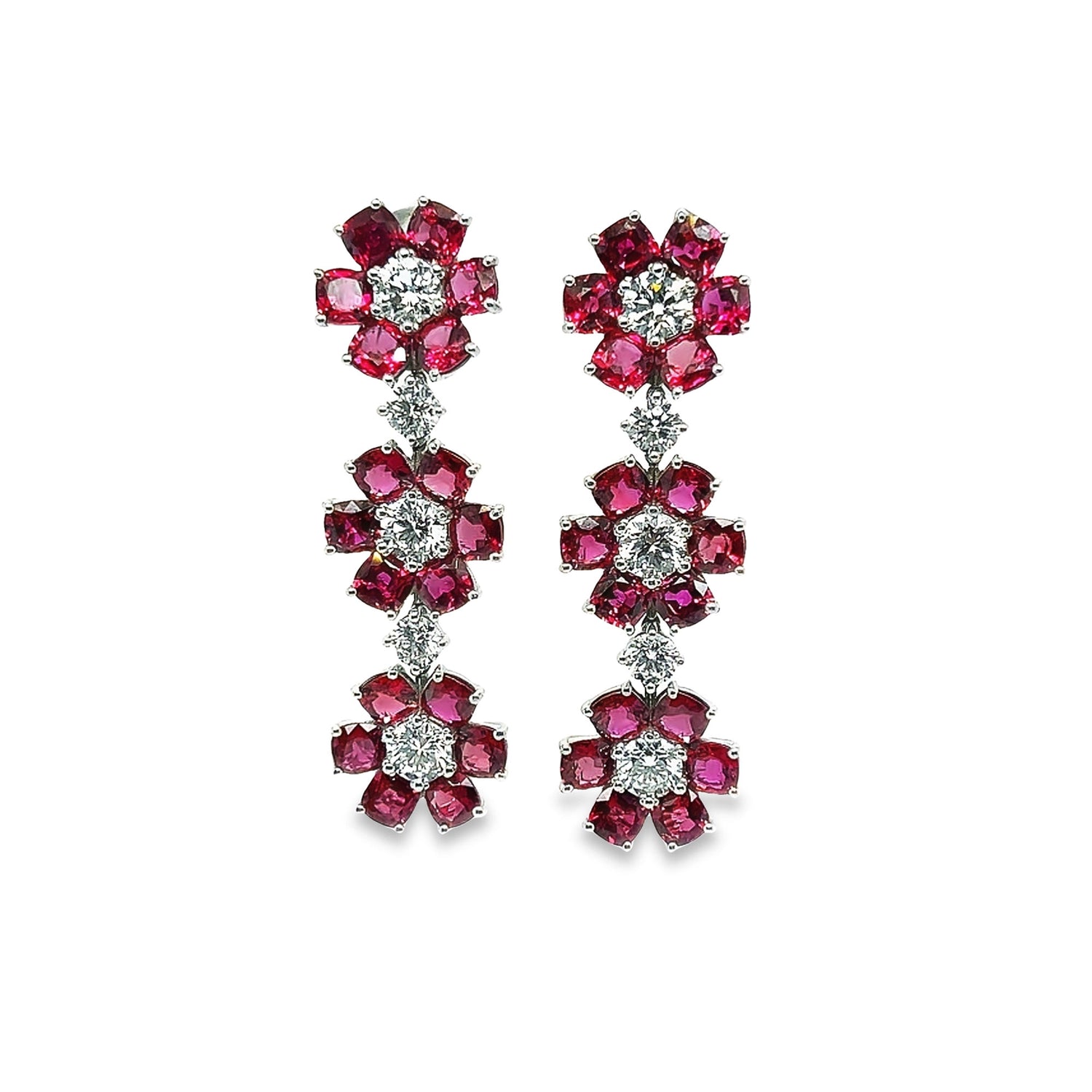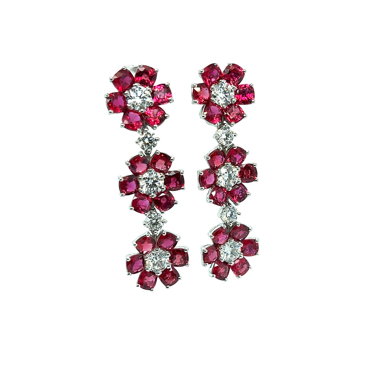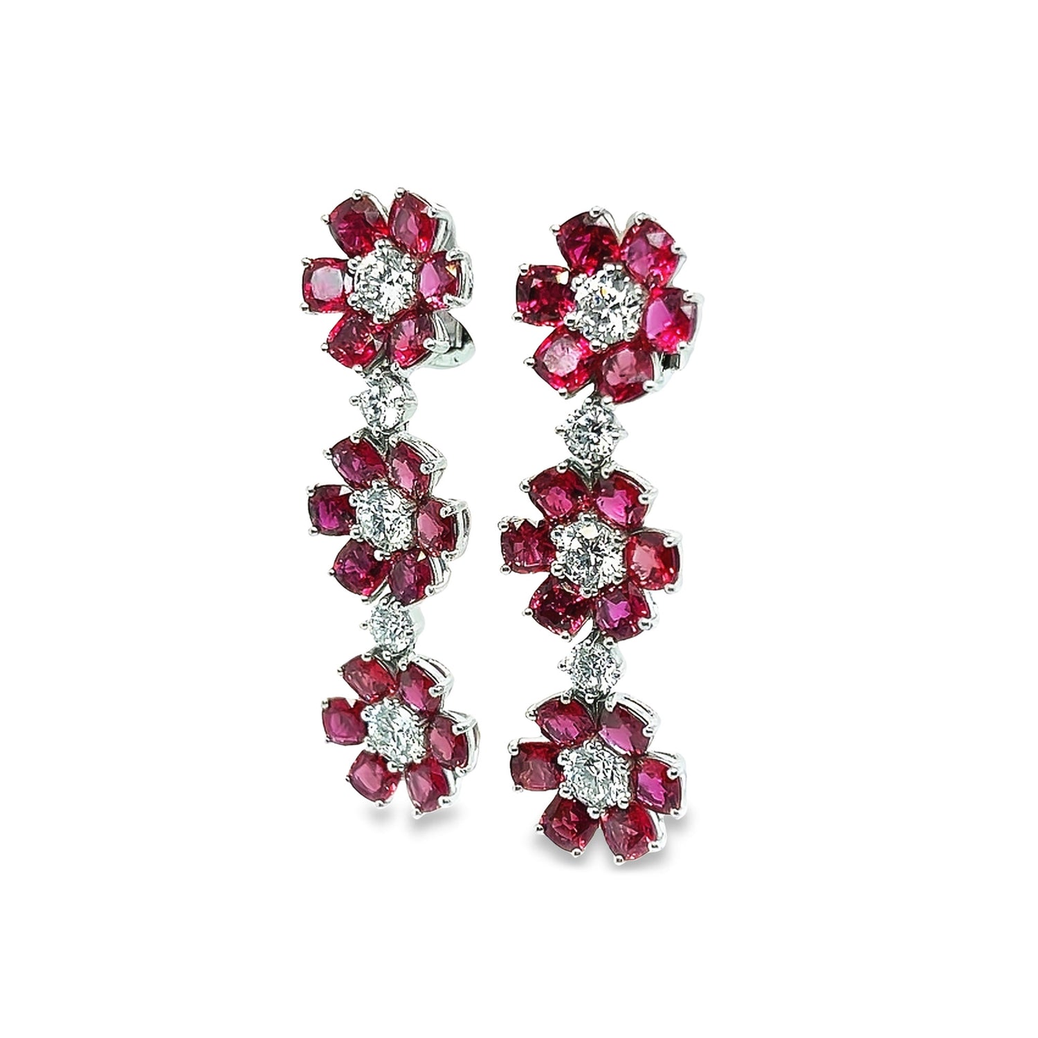 The focal point of each earring is the intricate arrangement of 36 rubies, creating a delicate chain that mimics the petals of a flower. At the center of the six flowers on each earring are six brilliant round diamonds. They pair perfectly with the Ruby Flower Ring, Bracelet, and Necklace.