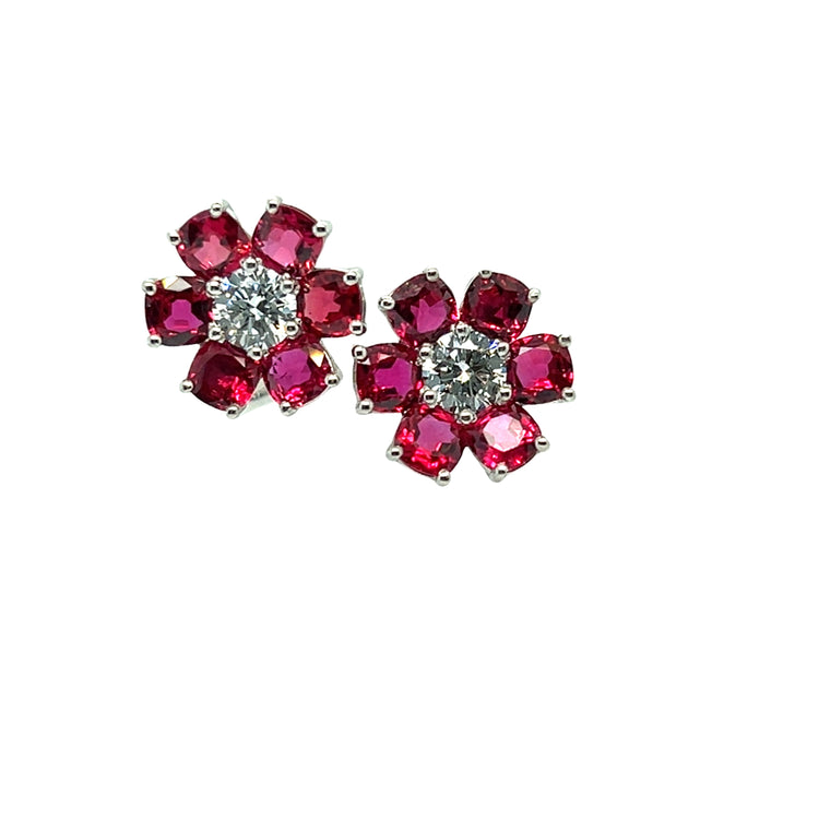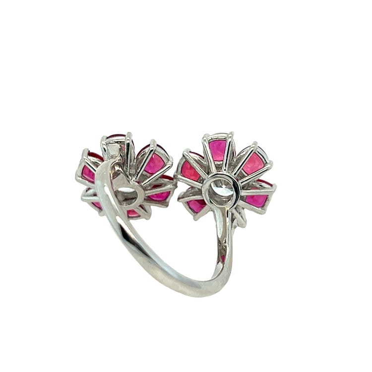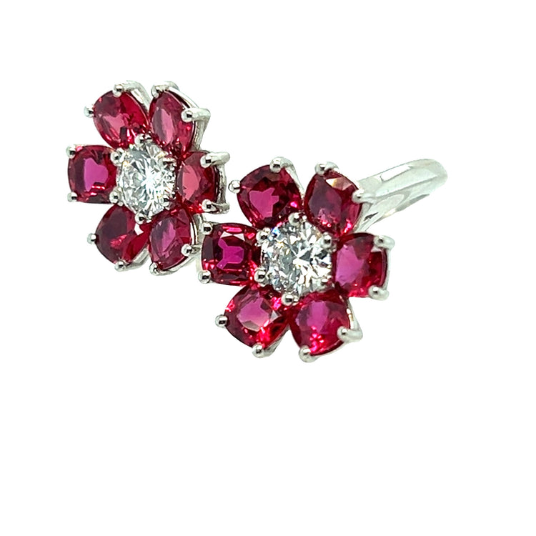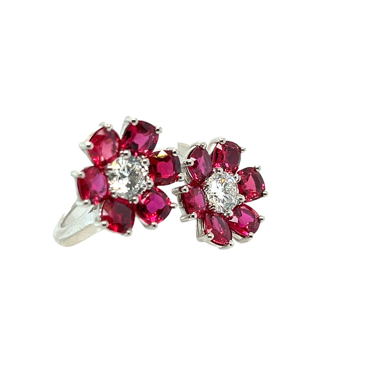 At the heart of each flower is a brilliant round diamond, GIA certified. These diamonds, known for their exceptional quality and sparkle, serves as the radiant centers of the floral design, adding a touch of brilliance and sophistication. The focal point of the ring is the stunning arrangement of 12 rubies, forming a delicate chain that mimics the petals of flowers. Each ruby, with its vibrant red hue, symbolizes love and passion, creating a visually striking and elegant display. They pair perfectly with the Ruby Flower Earrings, Bracelet, and Necklace.