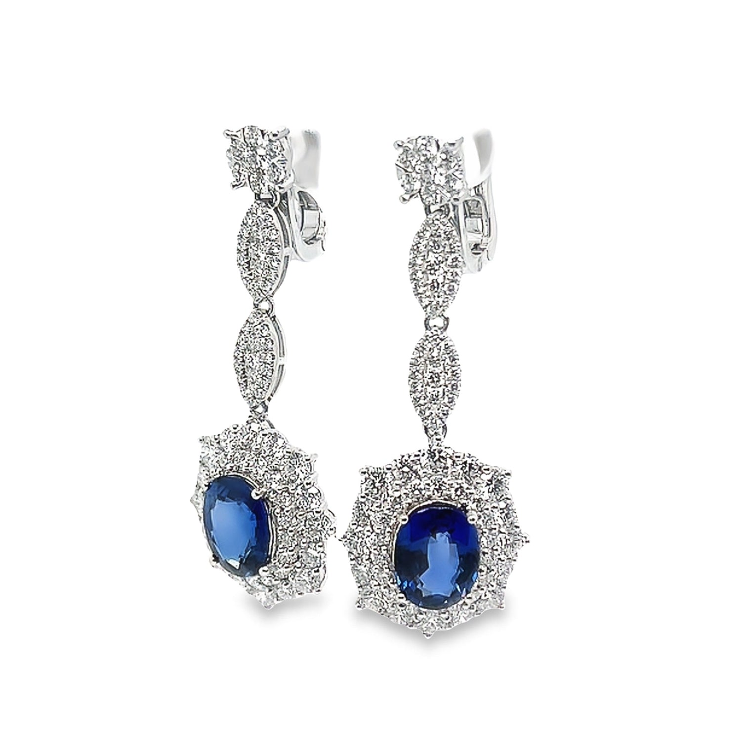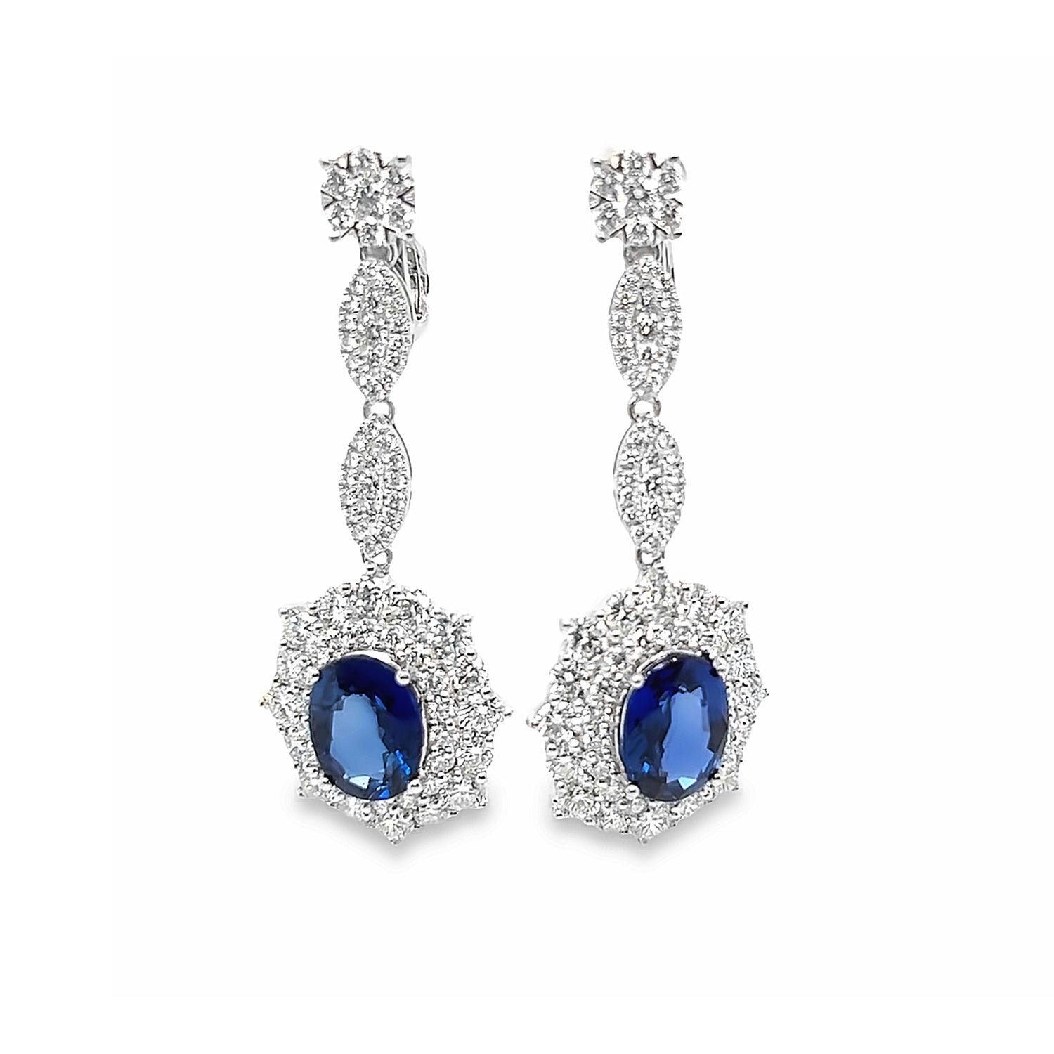 Crafted with 18KT white gold, these elegant earrings feature 2 oval cut sapphires and brilliant round natural white diamonds. Elevate any evening look with these timeless and sophisticated earrings.