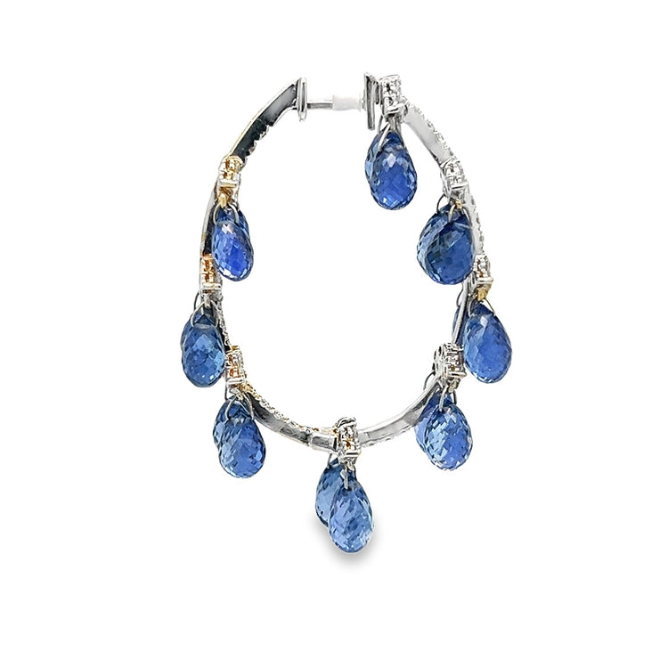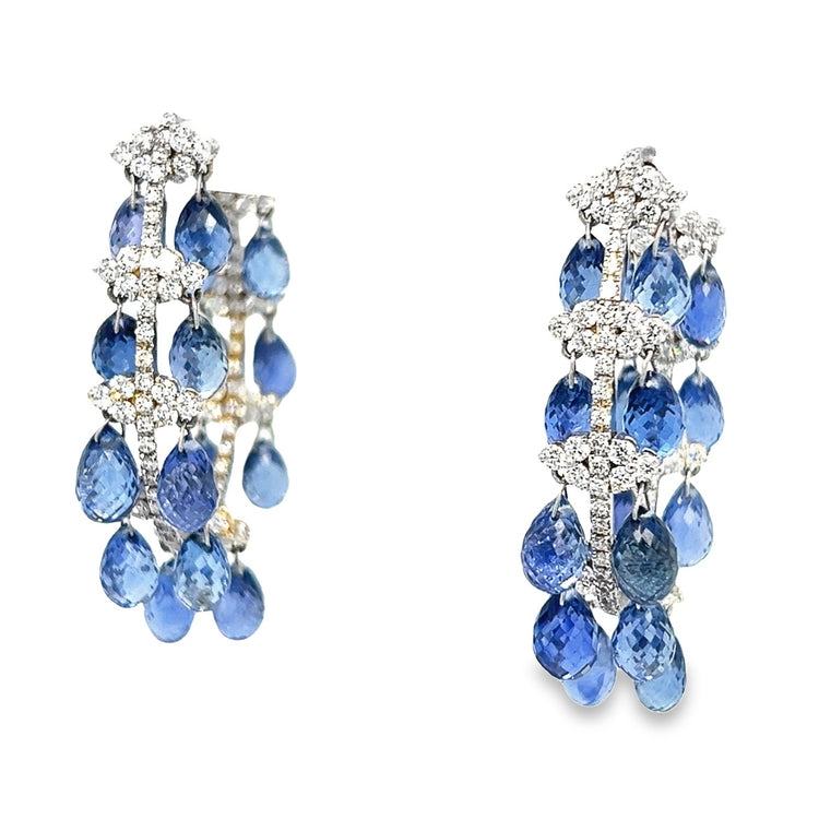 The focal point of these earrings is the exquisite briolette blue sapphire drops. Complementing the sapphire drops are brilliant round natural white diamonds. The setting for these breathtaking gems is crafted from 18-karat white gold, providing a luxurious and refined foundation.