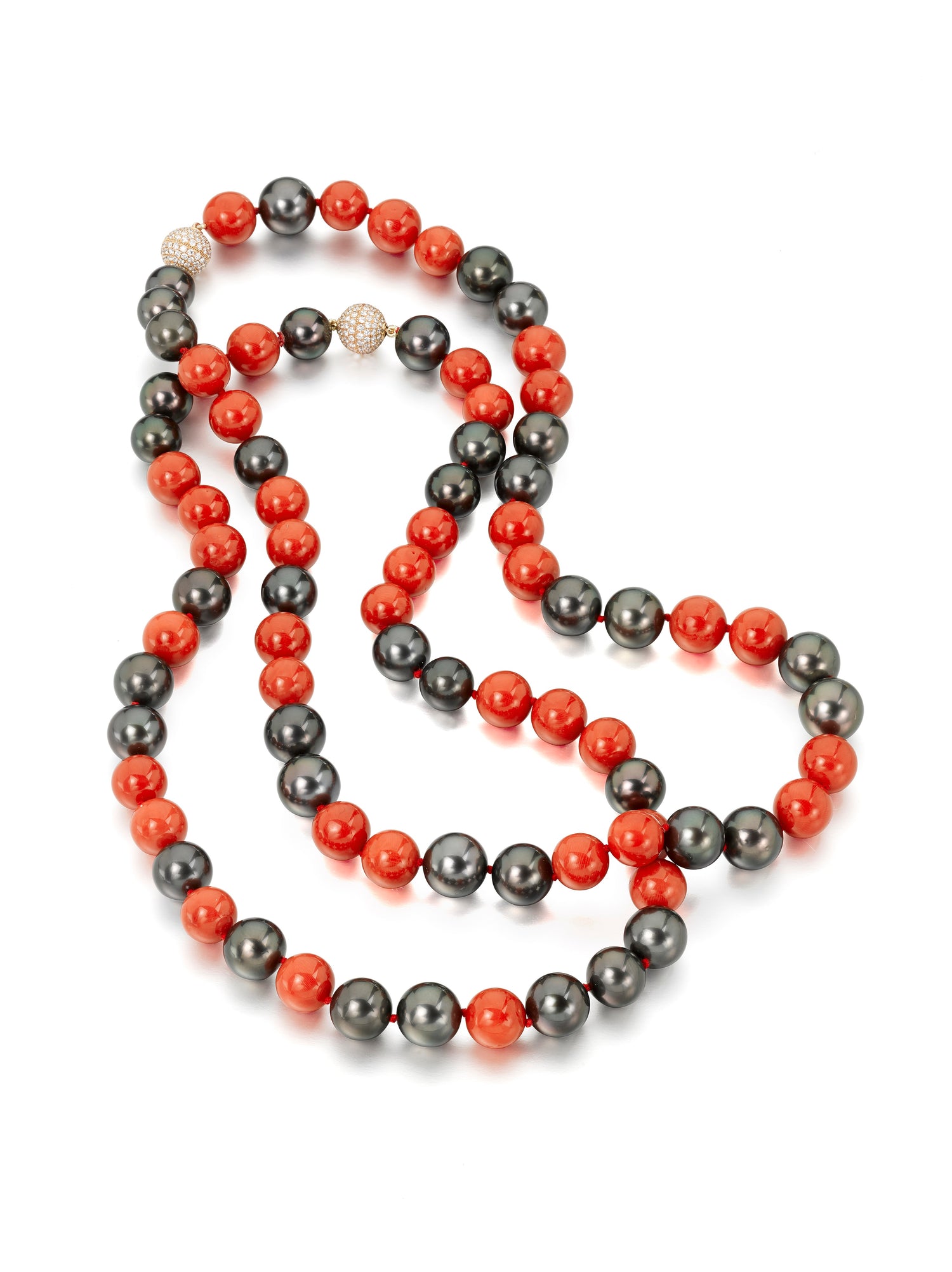 Prized for its all-natural crimson color and consistency, awe in the fiery beauty of this Sardinian Coral and Tahitian Pearl necklace. Boasting 21 coral beads, 19 pearls, and 126 diamonds, you'll feel the luxury of this necklace as soon as you put it on.