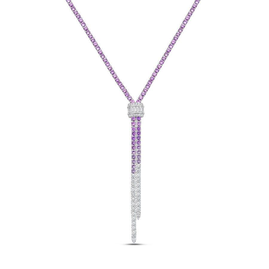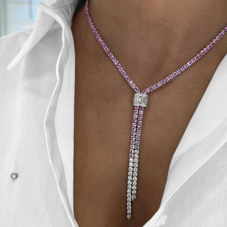 Vibrant pink sapphires are carefully set to create a perfect ombré, flowing elegantly down the neckline into brilliant white diamonds. A dazzling diamond baguette rondel gently pinches the strands at the center, adding a touch of sculptural beauty and brilliance.