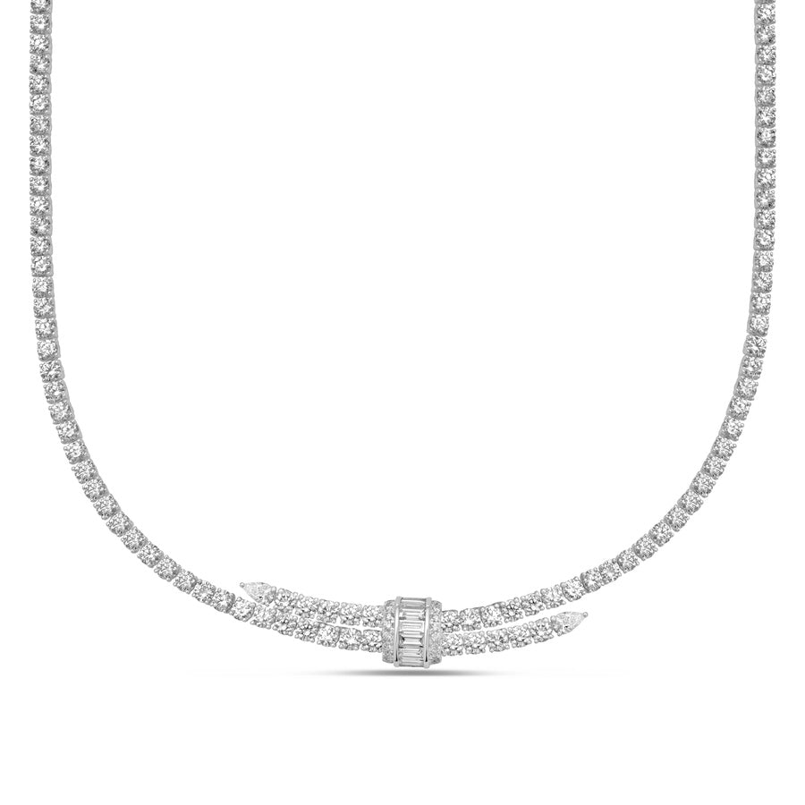 Brilliant white diamonds are set in 18k white gold, coming together in a perfectly balanced, all-diamond design. With diamonds on one side and a mirrored row on the other, the two strands meet at the base, joined by a sleek, stationary baguette rondel. This elegant detail creates the illusion that the strands are gracefully pulling through, adding depth, fluidity, and timeless sophistication.