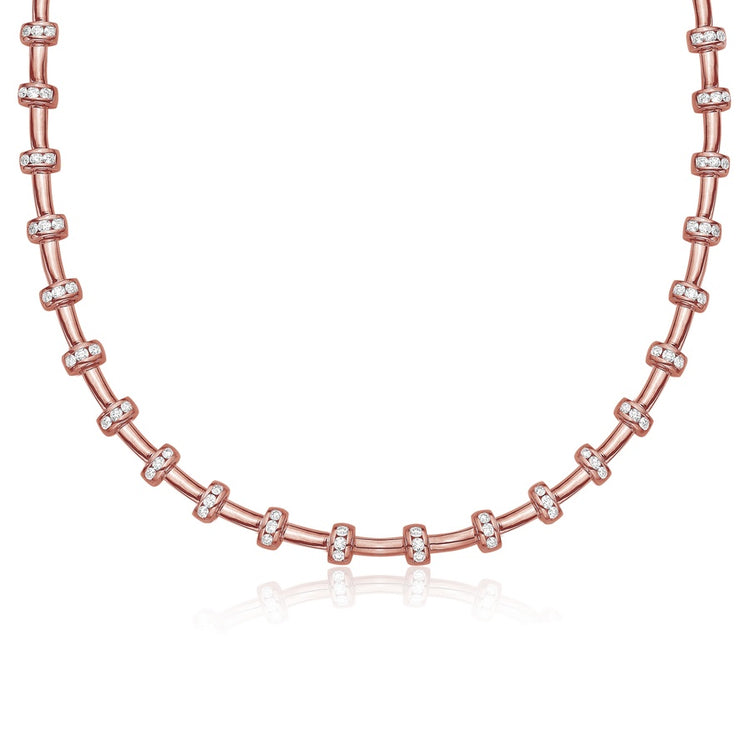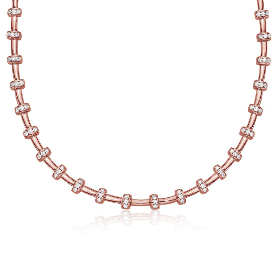 Beautiful solid 18k rose gold tubes are perfectly stationed between diamond sections, creating a striking rhythm of gold and brilliance. The alternating design brings a unique visual balance, blending bold structure with delicate sparkle for a modern and stackable look.