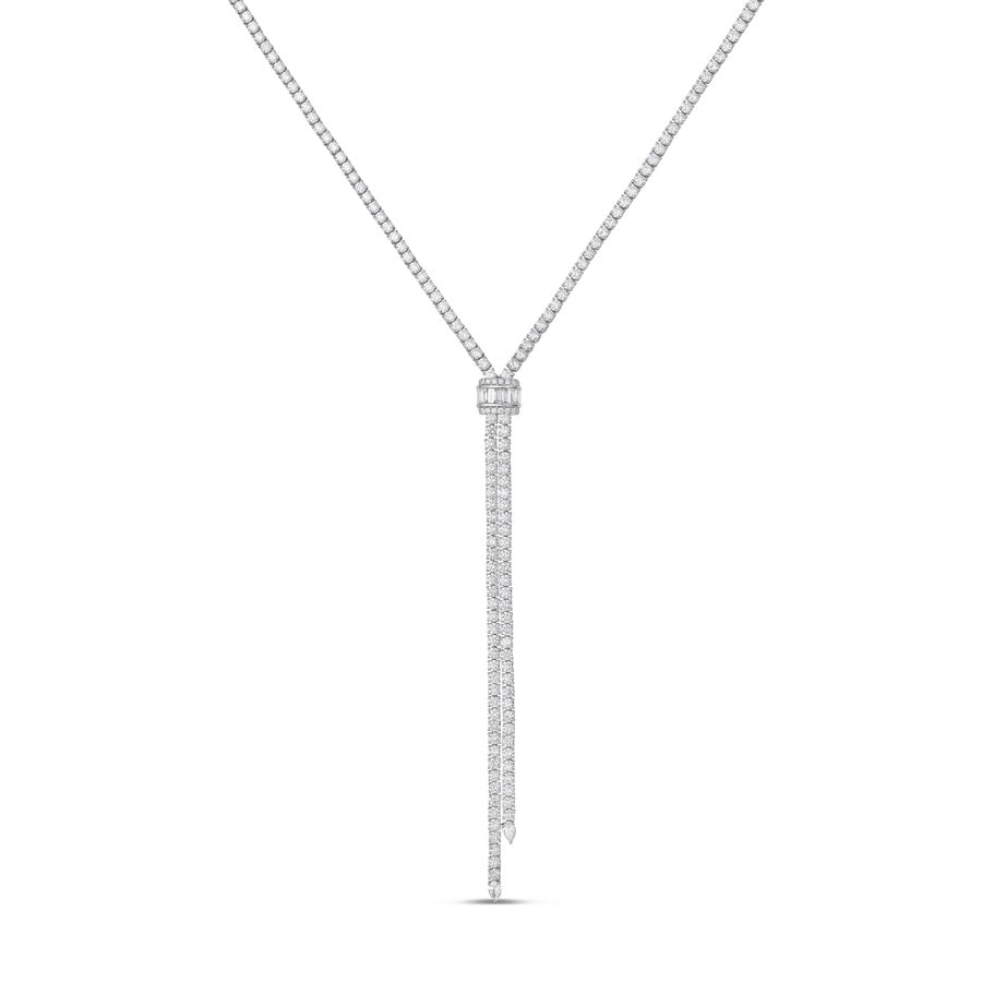 Brilliant round diamonds are set in 18k white gold, flowing elegantly down the neckline. At the center, a dazzling diamond baguette rondel gently pinches the strands, adding a touch of sculptural beauty and brilliance. From there, the round diamonds continue their descent in a graceful, parallel motion forming a striking and sophisticated lariat necklace.