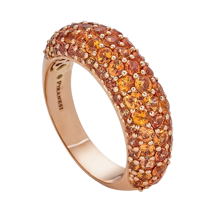The Small Dome Ring features bold and brilliant hues of orange colored sapphires that are as wearable as they are mesmerizing. Elegance meets playfulness, creating a statement that's uniquely yours, one dome at a time.