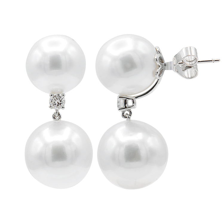 When it comes to opulent classics, these pearl earrings are a must-have. Luminous and perfectly matched, 11-14mm South Sea pearls are set with 18 karat white gold posts with secure push back closures and each connected by single, fiery round diamond. Versatile, wearable, and perfect for every day.