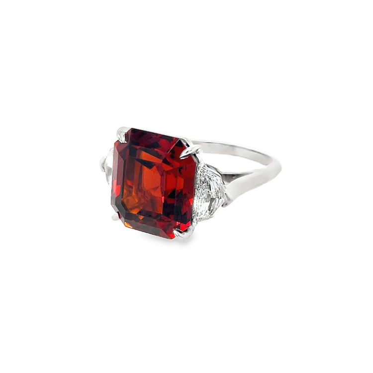 Indulge in the luxurious beauty of this Spessartine Garnet Ring. The Asscher cut showcases the vivid orange hue of the gemstone, while the Cadillac cut natural white diamonds add elegance and brilliance.
