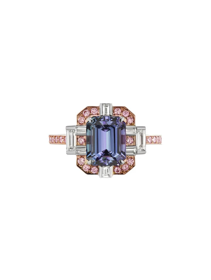 Art and gemstones come together with this elegant ring. It features a bluish-purple square emerald-cut tanzanite framed in shimmering Argyle Pink and white diamonds, set in pink and white gold.