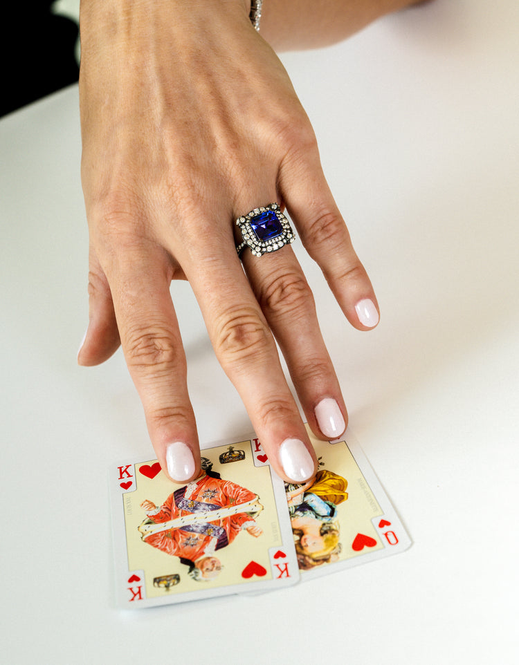 This lush and exotic blue gemstone is found in only one place on earth, near majestic Mount Kilimanjaro. Here we have Tanzanite, paired with diamonds and set in black rhodium for an understated sparkle, with a dark, radiant, luster and cool, edgy feel.