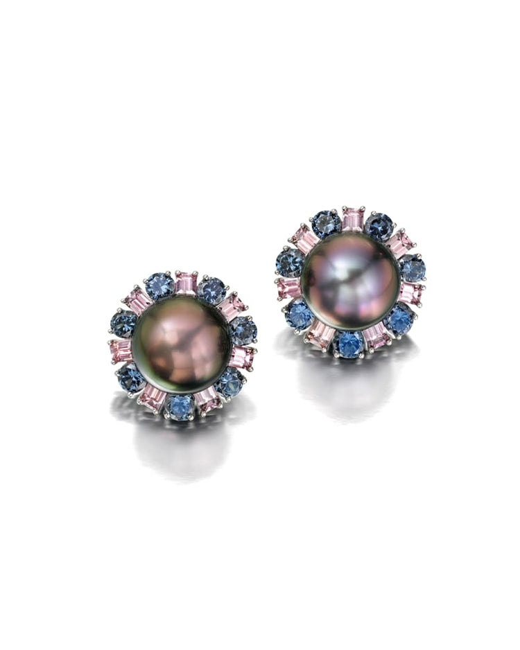 These earrings feature two lustrous Tahitian natural-color pearls, each measuring 13.9 x 13.6mm. The Tahitian pearls, known for their rich and varied hues, serve as the central focal points, exuding a natural and elegant beauty. Surrounding the Tahitian pearls are 14 brilliant round blue-violet garnets. Additionally, 14 emerald-cut Malaya Pink Garnets provide a complementary burst of warm, pink tones.