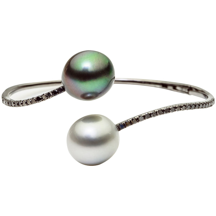 For a graceful touch of elegance and femininity, opt for this exquisite diamond and Tahitian pearl bangle bracelet. One peacock overtone pearl and one luminous, silver-white pearl bypass each other in a soft curve illuminated by brilliant-cut diamonds. Set in black gold, creating an enchanting look.