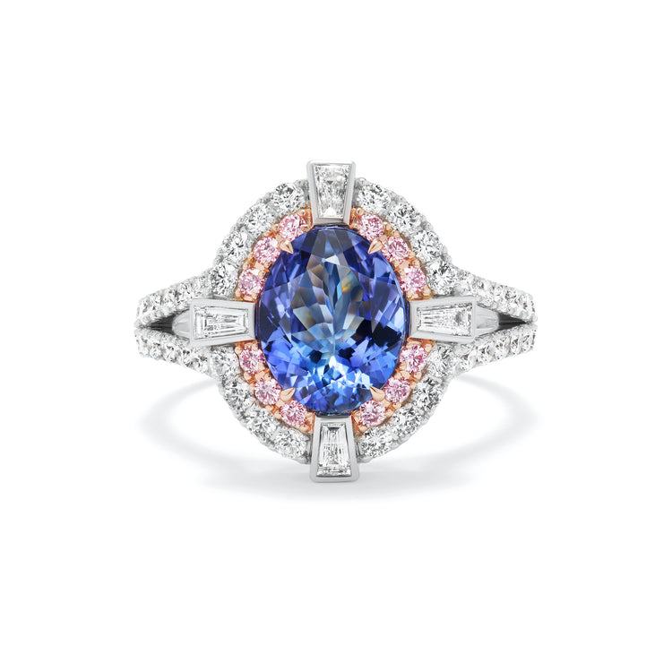 This exquisite ring showcases the rare beauty of Argyle Pink™ diamonds alongside an enchanting tanzanite, creating a stunning symphony of color and brilliance. The center stone, a rich purple-blue colored tanzanite, is surrounded by a halo of vibrant argyle pink diamonds then once again enveloped by even more diamonds, this time natural white.