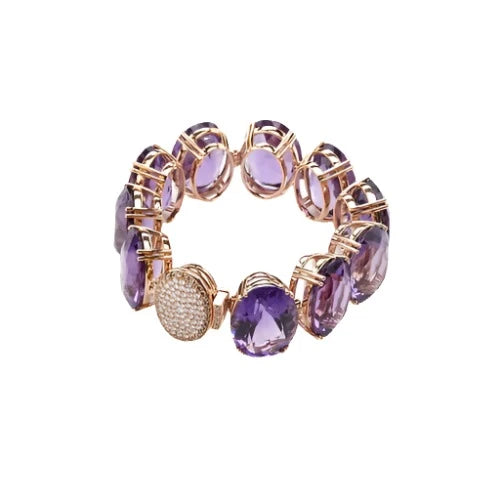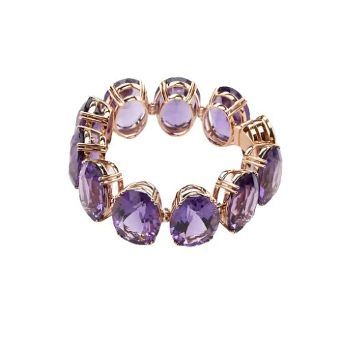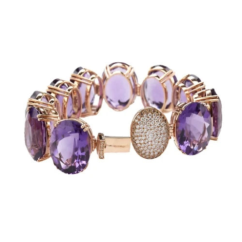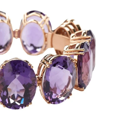 Amethysts are reported to open a person's third eye. The third eye is considered to be a source of power and wisdom. Crystal practitioners believe a person can use amethysts to enhance or sharpen spiritual visions and enlightenment. If this is true, then the wearer of this bracelet may be on their way to the divine via 230+ carats of amethyst.