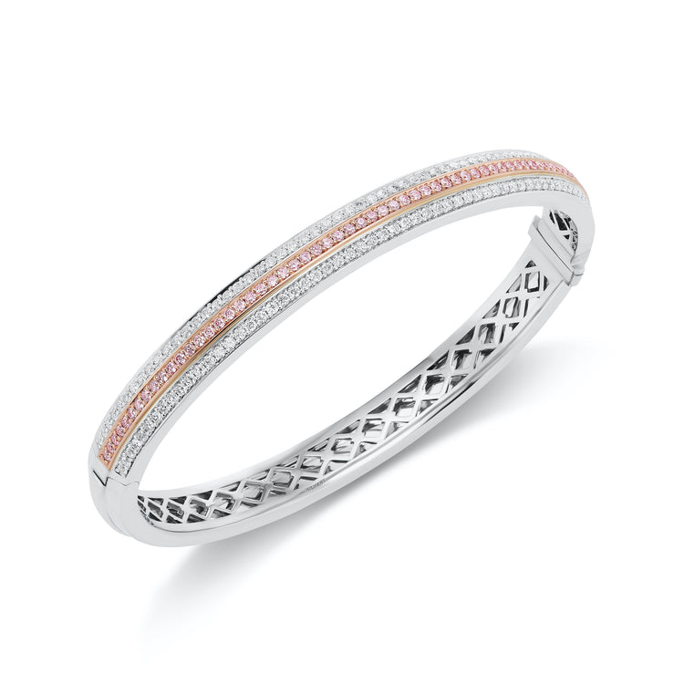 This cuff bracelet is a striking piece of jewelry that combines the rarity and beauty of argyle pink diamonds with the timeless elegance of white diamonds. The combination of precious metals and the contemporary design make it a captivating and luxurious accessory.