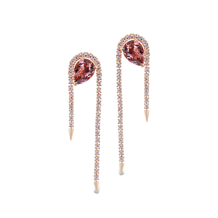 These tourmaline earrings are a true work of art, showcasing the beauty of deep pink tourmalines and the brilliance of argyle pink diamonds dripping down, all set in 18K rose gold.