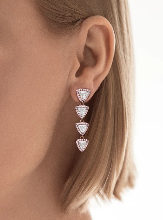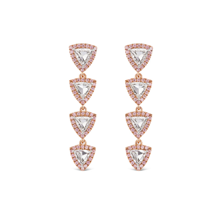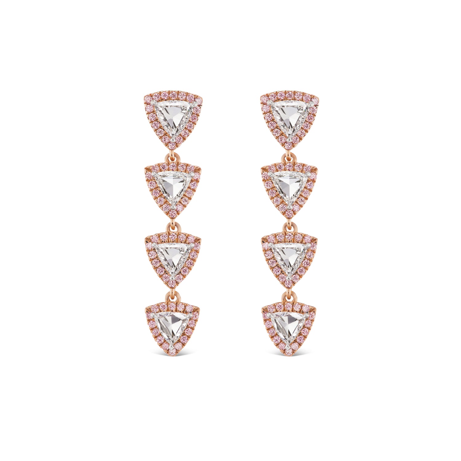These drop earrings combine modern design and elegance creating a show-stopping display of over 4 carats dazzling trillion white diamonds and 1.07 carats Argyle Pink diamonds, set in contrasting pink and white gold. This style is guaranteed to make heads turn.