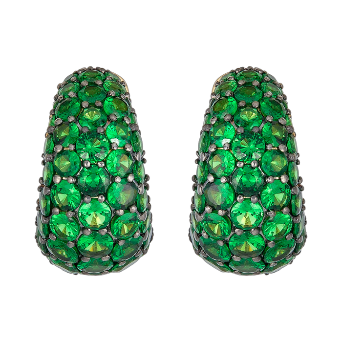 These earrings feature brilliant round green tsavorites. The brilliant green hues of the tsavorites are arranged along the hoops, creating a continuous circle of vivid color that catches the light with every movement. The combination of green tsavortie and 18KT yellow gold creates a unique color combination.