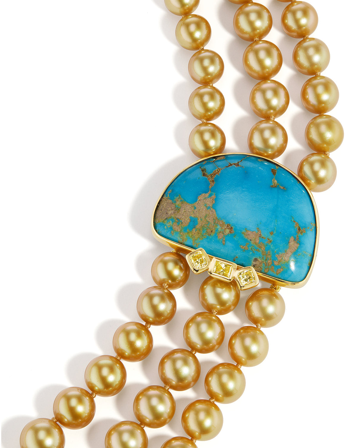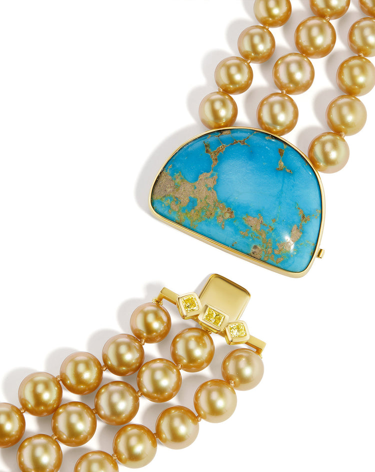 Truly the epitome of statement pieces, stand out in this turquoise, golden pearls, and yellow diamond necklace. One of the main stars of the necklace is 166 golden South Sea pearls varying in size from 8.0 to 12.9mm. Attached to the pearls is a half moon shape Mexican turquoise. To top it off, three radiant cuts are placed at the bottom of the turquoise to add some sparkle to the already magnificent necklace.